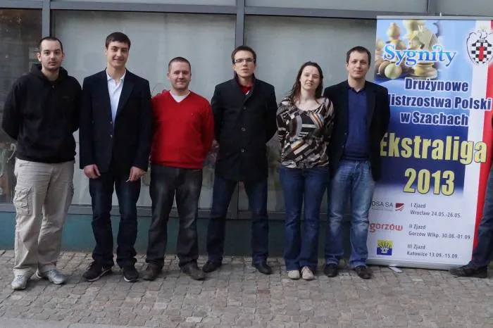 Zespół Polonii Wrocław podczas I Zjazdu Ekstraligi 2013, (od lewej): Dimitrios Mastrovasilis, Dariusz Świercz, Kamil Stachowiak, Mateusz Bartel, Jolanta Zawadzka, Radosław Wojtaszek, fot: www.zawadzka.eu.