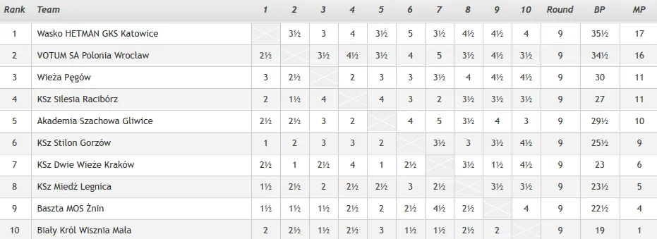 | Nr | Tytuł | Nazwisko Imię | Fed. | R. FIDE | Data ur. | R 1 | R 2 | R 3 | R 4 | R 5 | R 6 | R 7 | R 8 | R 9 | ||