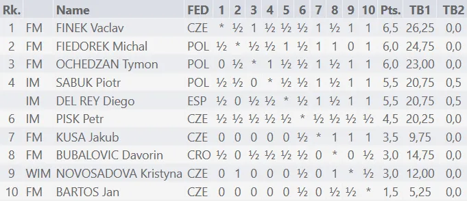 Wyniki końcowe - TUTAJ W turnieju OPEN zagrał Filip Ochędzan, który zajął 22. miejsce i zyskał 81 pkt ELO :) Pełne wyniki - TUTAJ fot. Czech Tour