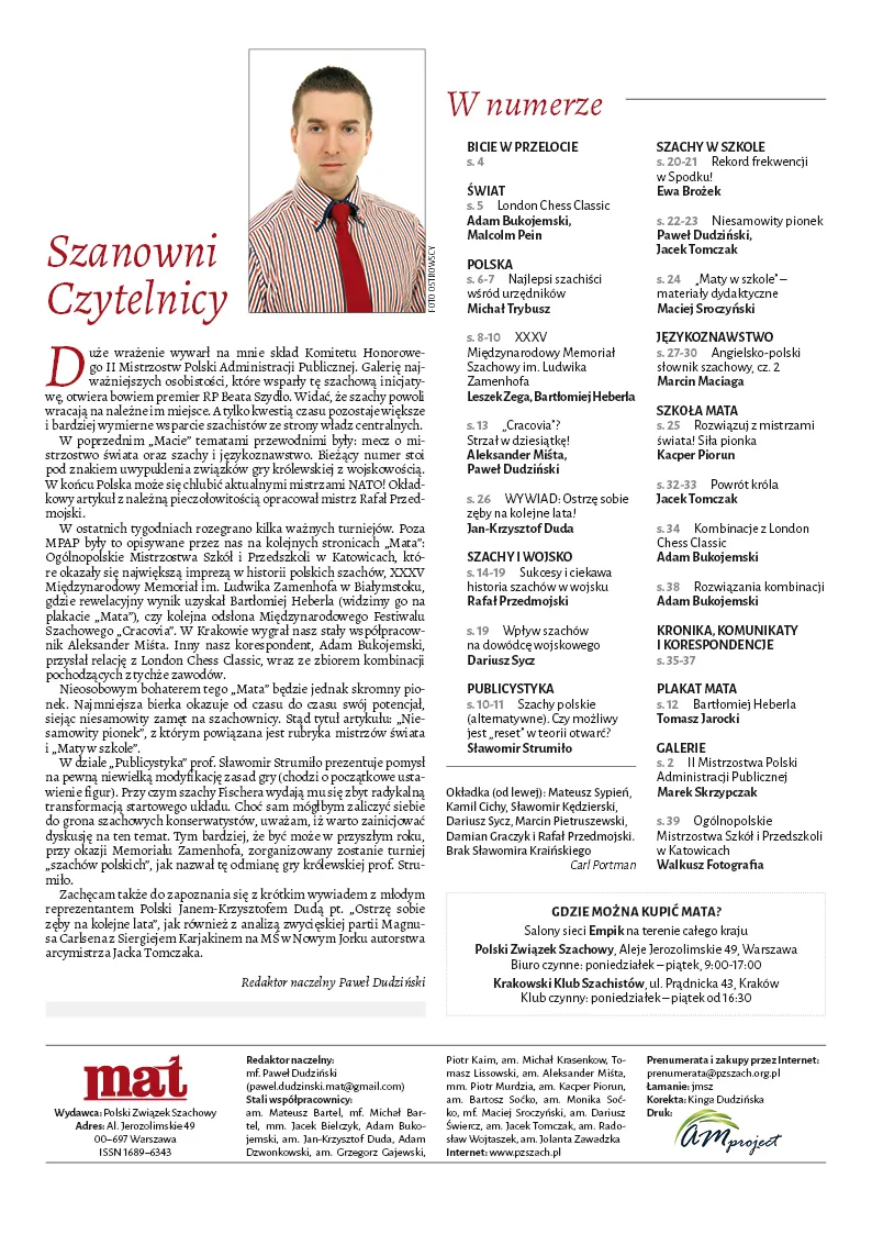 W ostatnich tygodniach rozegrano kilka ważnych turniejów. Poza MPAP były to opisywane przez nas na kolejnych stronicach „Mata”: Ogólnopolskie Mistrzostwa Szkół i Przedszkoli w Katowicach, które okazały się największą imprezą w historii polskich szachów, XXXV Międzynarodowy Memoriał im. Ludwika Zamenhofa w Białymstoku, gdzie rewelacyjny wynik uzyskał Bartłomiej Heberla (widzimy go na plakacie „Mata”), czy kolejna odsłona Międzynarodowego Festiwalu Szachowego „Cracovia”. W Krakowie wygrał nasz stały współpracownik Aleksander Miśta. Inny nasz korespondent, Adam Bukojemski, przysłał relację z London Chess Classic, wraz ze zbiorem kombinacji pochodzących z tychże zawodów.