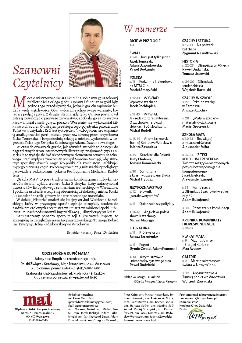 W dziale „Historia” znalazł się kolejny artykuł Wojciecha Bartelskiego, który w przystępny sposób opisuje olimpiady studenckie z udziałem czołowych arcymistrzów i mistrzów minionej epoki. Jubileusz PZSzach podsumowaliśmy publikacją „Olimpijczycy 90-lecia”.