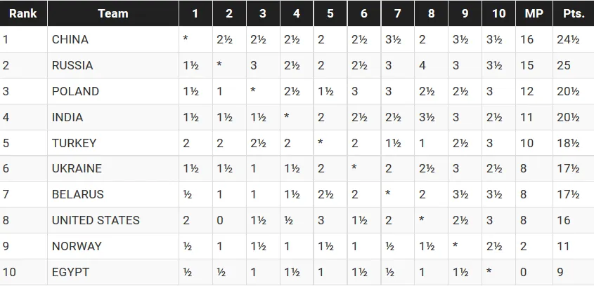 Mimo porażki w ostatniej rundzie naszej męskiej reprezentacji z Chinami na Drużynowych Mistrzostwach Świata, Polacy sięgnęli po brąz! Polki po zwycięstwie nad reprezentacją Wietnamu 2,5:1:5 zajmują 6 miejsce. Polacy mimo porażki z Chinami w ostatniej rundzie, zajmują ostatecznie 3 miejsce! W odniesieniu największego sukcesu w polskich drużynowych szachach męskich, od pamiętnego złota na Olimpiadzie Szachowej w 1930 roku, pomogła nam reprezentacja Białorusi, która pokonała 2,5:1,5 naszych konkurentów do brązowego medalu, czyli reprezentację Turcji. Przy naszej porażce z Chinami 1,5:2,5, Turcy musieli wygrać, aż 3,5:0,5 z Białorusinami, aby przeskoczyć nas w tabeli, co ostatecznie się nie wydarzyło. Uff! Gratulacje Panowie! Złoto zdobyli Chińczycy, którzy obronili tytuł z 2015 roku, srebro przypadło gospodarzom - reprezentacji Rosji. https://www.facebook.com/PZSzach/videos/10155545625082835/ źródło: Polski Związek Szachowy