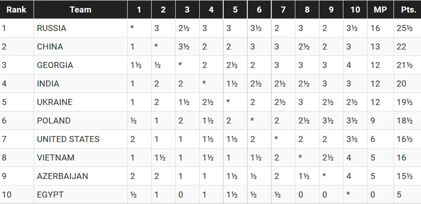 Niestety Panie nie osiągnęły tak dobrego wyniku jak Panowie, ale zwycięstwo w ostatniej rundzie 2,5:1,5 z reprezentacją Wietnamu i zajęcie ostatecznie 6 miejsca nie jest złym wynikiem. Złoto powędrowało do Rosjanek, srebro dla Chinek i brąz dla Gruzinek.