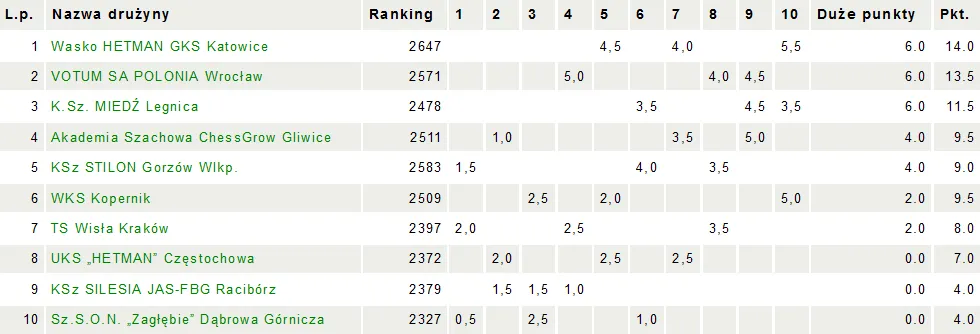 SzSON „Zagłębie” Dąbrowa Górnicza – K.Sz. Miedź Legnica 2,5 - 3,5 KSz Stilon Gorzów Wlkp. – WKS Kopernik 4 - 2 TS Wisła Kraków – Wasko HETMAN GKS Katowice 2 - 4 KSz SILESIA JAS-FBG Racibórz – Akademia Szachowa ChessGrow Gliwice 1 - 5 Strona Ekstraligi – TUTAJ Wyniki Ekstraligi – TUTAJ fot. Rafał Siwik