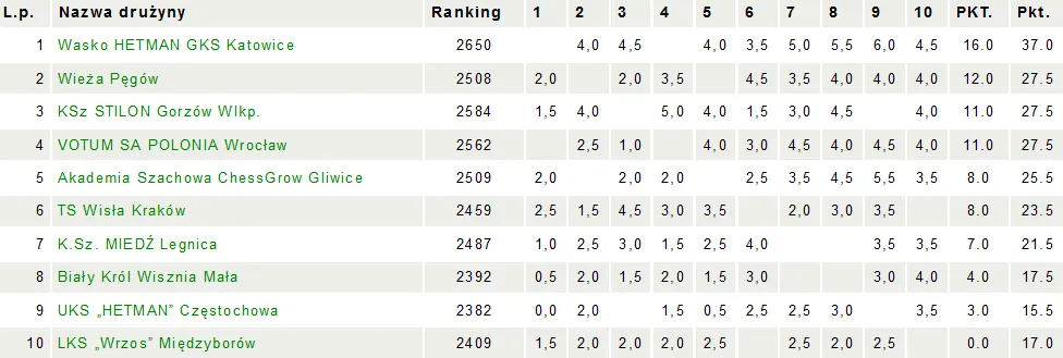 Kojarzenia rundy 9 Biały Król Wisznia Mała – KSz Miedź Legnica TS Wisła Kraków – LKS “Wrzos” Międzyborów KSz Stilon Gorzów Wlkp. – UKS “Hetman” Częstochowa Wieża Pęgów – Akademia Szachowa ChessGrow Gliwice VOTUM SA Polonia Wrocław – Wasko HETMAN GKS Katowice STRONA EKSTRALIGI SERWIS EKSTRALIGI