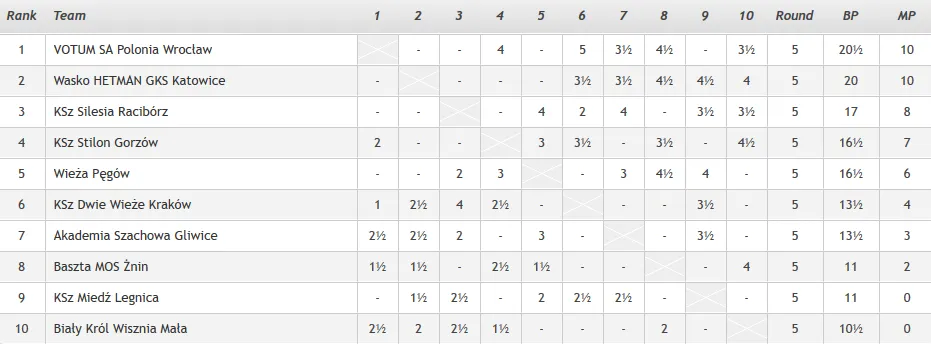 Wyniki rundy 5 Akademia Szachowa Gliwice – Wieża Pęgów 3 - 3 Klub Szachowy Dwie Wieże Kraków – KSz Miedź Legnica 3,5 - 2,5 Biały Król Wisznia Mała – Klub Szachowy Silesia Racibórz 2,5 - 3,5 Baszta MOS Żnin – Wasko HETMAN GKS Katowice 1,5 - 4,5 KSz Stilon Gorzów Wlkp. – VOTUM SA Polonia Wrocław 2 - 4 Tabela po 5. rundach
