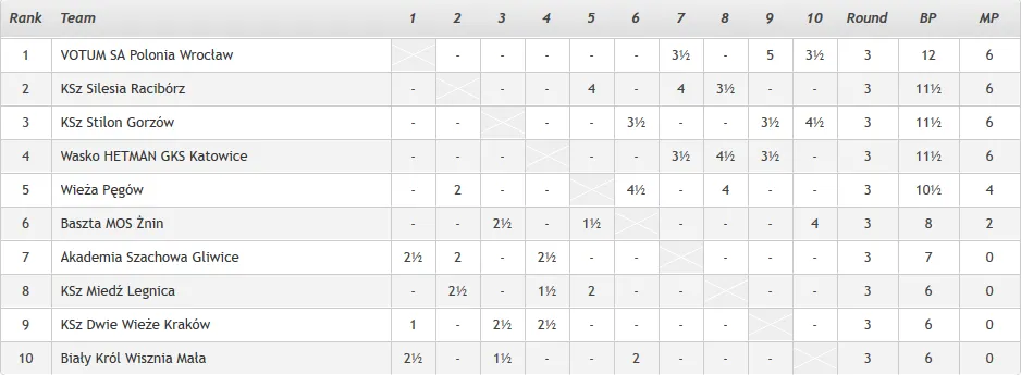 Wyniki rundy 3 KSz Miedź Legnica – Wieża Pęgów 2 - 4 Akademia Szachowa Gliwice – Klub Szachowy Silesia Racibórz 2 - 4 Klub Szachowy Dwie Wieże Kraków – Wasko HETMAN GKS Katowice 2,5 - 3,5 Biały Król Wisznia Mała – VOTUM SA Polonia Wrocław 2,5 - 3,5 Baszta MOS Żnin – KSz Stilon Gorzów Wlkp. 2,5 - 3,5 Tabela po 3. rundach
