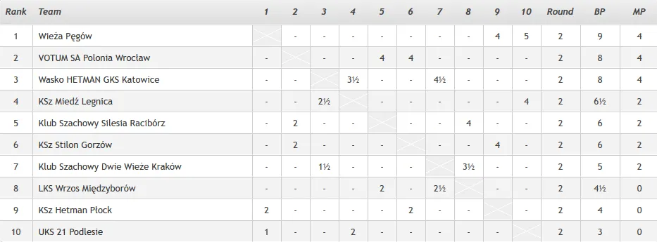 VOTUM SA Polonia Wrocław – KSz Silesia Racibórz 4 - 2 Harikrishna Pentala – Huschenbeth Niclas 1-0 Nasuta Grzegorz – Bartel Mateusz 1/2 Gumularz Szymon – Markowski Tomasz 1/2 Krzyżanowski Marcin – Tazbir Marcin 0-1 Wieczorek Oskar – Jakubowski Krzysztof 1/2 Worek Joanna – Zawadzka Jolanta 1/2 Partie polonistów z 2. rundy: 1. d4 Nf6 2. c4 e6 3. Nf3 d5 4. Nc3 dxc4 5. e3 a6 6. Bxc4 b5 7. Bd3 Bb7 8. Qe2 c5 9. dxc5 b4 10. Na4 Nbd7 11. O-O Nxc5 12. Nxc5 Bxc5 13. e4 Qb6 14. Ne5 O-O 15. Bf4 a5 16. Rac1 Rfd8 17. Rc2 Qa7 18. Bg5 Bd6 19. Nc4 Be7 20. e5 Nd5 21. Bxe7 Nxe7 22. Nd6 Ba6 23. Bxa6 Qxa6 24. Qe4 Rd7 25. h4 Rad8 26. h5 Nc8 27. Rc6 Nxd6 28. exd6 Qb5 29. Qf3 Qd5 30. Qxd5 exd5 31. Rfc1 Kf8 32. R1c5 Rxd6 33. Rxd6 Rxd6 34. Kf1 Ke7 35. Rxa5 Ke6 36. Ke2 Rc6 37. Kd2 Ke5 38. Ra7 Rf6 39. f3 Kd4 40. Ra4 Kc5 41. Ke3 Re6+ 42. Kd3 Re7 43. Ra5+ Kc6 44. g4 f5 45. g5 f4 46. Kd4 Re2 47. b3 Rh2 48. Rc5+ Kb6 49. Rxd5 Rxa2 50. g6 hxg6 51. Rd6+ Kb5 52. Rxg6 Rh2 53. Rg5+ Kc6 54. Ke4 Kd6 55. Kxf4 Ke6 56. Rxg7 Rxh5 57. Rb7 Rh4+ 58. Kg5 Rd4 59. f4 Kd6 60. f5 Kc5 61. f6 Rd3 62. f7 Rf3 63. Kg6 1-0 1. e4 e6 2. d4 d5 3. Nc3 Nf6 4. Bg5 dxe4 5. Nxe4 Be7 6. Bxf6 gxf6 7. Qd2 b6 8. O-O-O Bb7 9. Nc3 c6 10. f4 f5 11. Nf3 Nd7 12. g3 Qc7 13. Bg2 O-O-O 14. Rhe1 Bf6 15. Qe2 b5 16. a3 Nb6 17. Ne5 Bxe5 18. dxe5 Nc4 19. Qf2 Qb6 20. Qxb6 Nxb6 21. Rxd8+ Rxd8 22. Bf3 a5 23. Rd1 Rxd1+ 24. Nxd1 Kd7 25. Ne3 Ke7 26. g4 fxg4 27. Nxg4 Nd7 28. Kd2 f5 29. Nf2 Kd8 30. Nd3 1/2-1/2 1. e4 c5 2. Nf3 Nc6 3. Bb5 e6 4. O-O Nge7 5. d4 cxd4 6. Nxd4 Ng6 7. Be3 Be7 8. Be2 O-O 9. Nc3 d6 10. Nb3 b6 11. Qd2 Bb7 12. Rad1 Qd7 13. f4 Rfd8 14. Bg4 Ba6 15. Rfe1 Qb7 16. Qf2 Rac8 17. g3 Nf8 18. Bf3 Nd7 19. g4 Bf8 20. g5 Qc7 21. h4 b5 22. Be2 Qb7 23. Qf1 Nb4 24. Rd2 Rxc3 25. bxc3 Nxa2 26. c4 Nc3 27. Na5 Qc7 28. cxb5 Qxa5 29. bxa6 Nxe4 30. Rdd1 d5 31. Bxa7 Bb4 32. Ra1 Qc7 33. Be3 Ng3 34. Qf3 Bxe1 35. Rxe1 Nf5 36. Bf2 Nc5 37. Ra1 Ne4 38. a7 Ra8 39. Bd3 Nxf2 40. Qxf2 Nd6 41. Ra6 Nc8 42. f5 e5 43. Bb5 Rxa7 44. Rc6 Qd8 45. Qc5 Ra8 46. Rc7 Nd6 47. Rd7 Qa5 48. Qxd5 Qb6+ 49. Kg2 Rd8 50. Rxd8+ Qxd8 51. Bd3 Qe7 52. Qa8+ Qf8 53. Qd5 Qe7 54. Qa8+ Qf8 55. Qd5 Qe7 56. Qa8+ 1/2-1/2 1. d4 Nf6 2. c4 e6 3. Nc3 Bb4 4. f3 Nc6 5. a3 Bxc3+ 6. bxc3 d6 7. e4 b6 8. Bd3 Na5 9. Ne2 Nd7 10. O-O Ba6 11. f4 Qe7 12. Ng3 O-O-O 13. Qe2 f6 14. Rb1 c5 15. e5 f5 16. Re1 g6 17. a4 Rhe8 18. Ba3 Qh4 19. Qf1 dxe5 20. fxe5 Bb7 21. dxc5 Nc6 22. cxb6 Ndxe5 23. Be2 a5 24. Rbd1 Rxd1 25. Rxd1 Rd8 26. Rd6 Rxd6 27. Bxd6 Qg5 28. Qf2 Qc1+ 29. Nf1 Qxc3 30. c5 Nf7 31. Bf4 Nd4 32. Be3 e5 33. Bxd4 exd4 34. Bf3 Qxc5 35. Bxb7+ Kxb7 36. Nd2 Qxb6 37. Qf3+ Ka7 38. Qd5 Nd6 39. h3 Nb7 40. Nb3 d3+ 41. Kf1 Qe3 42. Nd4 Qc1+ 43. Kf2 d2 44. Nb5+ Kb6 45. Qd4+ Qc5 46. Ke2 Qxd4 47. Nxd4 Nc5 48. Kxd2 Nxa4 49. Ne6 Nc5 50. Nf8 Ne4+ 51. Kd3 Nf6 52. Kc4 Kc6 53. Ne6 Kd6 54. Nd4 Ke5 0-1 1. e4 c5 2. Nc3 a6 3. g3 b5 4. Bg2 Bb7 5. f4 e6 6. d3 Ne7 7. Nf3 Nec6 8. O-O Be7 9. f5 O-O 10. Be3 b4 11. Na4 exf5 12. Nxc5 Qb6 13. d4 fxe4 14. Nxe4 Na5 15. Qd3 Qb5 16. Ne5 d6 17. Qxb5 axb5 18. Nd3 Na6 19. Rf5 Nc4 20. Bg5 Rae8 21. Re1 f6 22. Bc1 d5 23. Nef2 Nb6 24. Nh3 g5 25. Rff1 Kg7 26. Nhf2 Bc8 27. Nd1 Nc7 28. Nc5 f5 29. Nf2 Bf6 30. c3 bxc3 31. bxc3 Rxe1 32. Rxe1 Re8 33. Rxe8 Nxe8 34. Nfd3 Nd6 35. Ba3 Ne4 36. Bb4 Nc4 37. a4 bxa4 38. Nxa4 Ne3 39. Bf3 Ba6 40. Nac5 Bc4 41. Ne5 Bxe5 42. dxe5 g4 43. Bg2 Nd1 44. Ne6+ Kg8 45. Nd4 Ndxc3 46. Bxe4 Nxe4 47. e6 Bd3 48. Nxf5 Bb5 49. Ne7+ Kg7 50. Nxd5 Bc6 51. e7 Kf7 52. Ne3 Nf6 53. Nf5 Bd7 54. Ne3 Be6 55. Kf2 Nd5 56. Nxd5 1/2-1/2 1. e4 c5 2. Nf3 d6 3. d4 cxd4 4. Nxd4 Nf6 5. Nc3 a6 6. Be3 e5 7. Nb3 Be6 8. f3 h5 9. Qd2 Nbd7 10. O-O-O Be7 11. Kb1 b5 12. Nd5 Bxd5 13. exd5 Nb6 14. Bxb6 Qxb6 15. Na5 Rc8 16. Nc6 Nxd5 17. Nxe7 Nxe7 18. Qxd6 Qxd6 19. Rxd6 Nc6 20. Be2 Ke7 21. Rdd1 g6 22. Rhe1 Rhd8 23. c3 Ke6 24. a4 Rxd1+ 25. Rxd1 Rb8 26. axb5 axb5 27. b4 Ne7 28. Kb2 Nf5 29. Ra1 Nd6 30. Kb3 f5 31. Ra6 Kd5 32. Ra7 Rb6 33. Rg7 Nc4 34. Rc7 Nd6 35. Rg7 Nc4 36. Rc7 Nd6 37. Rg7 1/2-1/2 Wyniki rundy 2 KSz Stilon Gorzów Wlkp. – KSz Hetman Płock 4 - 2 UKS 21 Podlesie – Wieża Pęgów 1 - 5 Wasko HETMAN GKS Katowic – KSz Miedź Legnica 3,5 - 2,5 LKS Wrzos Międzyborów – Klub Szachowy Dwie Wieże Kraków 2,5 - 3,5 VOTUM SA Polonia Wrocław – Klub Szachowy Silesia Racibórz 4 - 2 Tabela po 2 rundach: