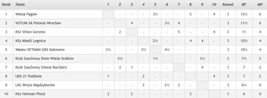 KSz Dwie Wieże Kraków - VOTUM SA Polonia Wrocław 2,5 - 3,5 Matuszewski Michał - Harikrishna Pentala 0-1 Bartel Mateusz - Leniart Arkadiusz 1/2 Nguyen Piotr - Gumularz Szymon 1/2 Tazbir Marcin - Zwardon Vojtech 1/2 Szustakowski Antoni - Wieczorek Oskar 0-1 Zawadzka Jolanta - Leks Maria 0-1 Partie polonistów z 3. rundy: 1. d4 Nf6 2. Bg5 d5 3. Nd2 c5 4. Bxf6 gxf6 5. dxc5 e6 6. e4 Nc6 7. Ne2 f5 8. exf5 Bxc5 9. Nb3 Bb6 10. Nf4 Qf6 11. Be2 Qxf5 12. Qd2 e5 13. Nd3 e4 14. Nf4 d4 15. O-O-O Bd7 16. Bc4 Ne5 17. Bd5 O-O-O 18. g3 Nf3 19. Qb4 Bc6 20. Bxc6 bxc6 21. a4 d3 22. Qc3 Nd4 23. cxd3 Qxf4+ 24. gxf4 Ne2+ 25. Kc2 Nxc3 26. Kxc3 exd3 27. Rxd3 Rxd3+ 28. Kxd3 Bxf2 29. Rc1 Kd7 30. Nc5+ Kc7 31. Ke4 Rd8 32. b4 Rd5 33. Nb3 f5+ 34. Kf3 Bb6 35. Ke2 Rd6 36. a5 Re6+ 37. Kd3 Bf2 38. Rc2 Re3+ 39. Kc4 Re4+ 40. Kd3 Rxb4 41. Rxf2 Rxb3+ 42. Kc4 Rb5 43. Ra2 a6 44. Ra3 h5 45. Rh3 Rxa5 46. Rxh5 Kb6 47. Kb4 Rd5 48. Kc4 Rc5+ 49. Kb3 Kb5 50. h4 a5 51. Rh7 a4+ 52. Ka3 Rc3+ 53. Kb2 Rf3 54. h5 Rxf4 55. Rf7 Kb4 56. Rb7+ Kc5 57. Rf7 Kd5 58. h6 Ke6 59. Rc7 Kf6 60. Rxc6+ Kg5 61. Ra6 Rh4 62. Kc2 Rxh6 63. Rxa4 Rd6 64. Ra8 f4 65. Rg8+ Kh4 66. Rf8 Kg3 67. Rg8+ Kf2 68. Rf8 f3 69. Rg8 Ke2 70. Re8+ Kf1 71. Rf8 f2 72. Rg8 Rd5 0-1 1. e4 e5 2. Nf3 Nc6 3. d4 exd4 4. Nxd4 Bc5 5. Nb3 Bb4+ 6. c3 Be7 7. Bf4 d6 8. N1d2 Bg5 9. Bg3 Nh6 10. h4 Be7 11. Bf4 Ng4 12. Be2 Nge5 13. Be3 f5 14. exf5 Bxf5 15. Nd4 Nxd4 16. cxd4 Nf7 17. Qb3 Bxh4 18. Qb5+ Bd7 19. Qxb7 Be7 20. Bf3 Rb8 21. Qxa7 O-O 22. Rc1 Rxb2 23. Rxc7 Rxa2 24. Qxa2 Qxc7 25. O-O Kh8 26. Bd5 Nd8 27. Ne4 Bf5 28. Rc1 Qd7 29. Qa5 Qe8 30. Ng3 Bg6 31. Rc8 Bh4 32. Qc3 Qb5 33. Qc4 Qb1+ 34. Qc1 Qb5 35. Bf3 Re8 36. Ra8 Qb3 37. Bg5 Bxg3 38. fxg3 Ne6 39. Rxe8+ Bxe8 40. Be3 Qb8 41. Kh2 Qd8 42. Qa3 h6 43. Qa7 Bg6 44. Bd5 Ng5 45. Bf4 Kh7 46. Qa3 Nf7 47. Bxf7 1/2-1/2 1. Nf3 Nf6 2. c4 e6 3. g3 a6 4. Bg2 b5 5. b3 Bb7 6. O-O Be7 7. Nc3 b4 8. Na4 O-O 9. d4 a5 10. Bb2 d6 11. Rc1 Nbd7 12. c5 Be4 13. Bh3 Ra6 14. Nd2 Bc6 15. cxd6 cxd6 16. e4 Bb5 17. Re1 Rc6 18. Rxc6 Bxc6 19. Qe2 Qb8 20. Bf1 Rc8 21. Rc1 Bd8 22. f3 Bxa4 23. bxa4 Rxc1 24. Bxc1 Bb6 25. Nb3 d5 26. Qb5 Qa7 27. exd5 Nxd5 28. Kg2 h6 29. Qc6 Ne7 30. Qb5 Nf6 31. a3 bxa3 32. Bxa3 Ned5 33. Bc5 Qc7 34. Bd3 g6 35. Be4 1/2-1/2 1. e4 c5 2. Nf3 Nc6 3. Bb5 g6 4. Bxc6 dxc6 5. d3 Bg7 6. h3 Nf6 7. Nc3 O-O 8. Be3 b6 9. Qd2 e5 10. Bh6 Qd6 11. O-O Nh5 12. Ne2 Nf4 13. Bxg7 Nxe2+ 14. Qxe2 Kxg7 15. b3 f6 16. a4 Be6 17. Nd2 g5 18. Nc4 Qd7 19. Ne3 Rh8 20. Qh5 Qf7 21. Qxf7+ Kxf7 22. Kh2 h5 23. h4 Ke7 24. g3 g4 25. Kg2 a5 26. Nc4 Ra6 27. f4 gxf3+ 28. Kxf3 Rg8 29. Rg1 Rga8 30. Ne3 Rh8 31. Nc4 Rha8 32. Rh1 Rg8 33. Rh2 Bg4+ 34. Kf2 Be6 35. Rhh1 Rb8 36. Ne3 Rg8 37. Rag1 Raa8 38. Kf3 1/2-1/2 1. d4 Nf6 2. c4 g6 3. Nc3 Bg7 4. e4 d6 5. Be2 O-O 6. Bg5 Na6 7. Qd2 e5 8. d5 Qe8 9. f3 Nh5 10. Bd1 Bd7 11. Nge2 f5 12. exf5 gxf5 13. Bc2 Nb4 14. Bb1 a5 15. Be3 Kh8 16. g3 c6 17. O-O cxd5 18. cxd5 f4 19. gxf4 exf4 20. Nxf4 Nxf4 21. Bxf4 Bh3 22. Be4 Bxf1 23. Rxf1 Be5 24. Bg3 Qe7 25. f4 Bg7 26. Bf3 Qf6 27. a3 Qd4+ 28. Qxd4 Bxd4+ 29. Kh1 Nd3 30. Nb5 Bxb2 31. Be2 Nc5 32. Rb1 Bf6 33. Nxd6 Be7 34. f5 Rad8 35. Be5+ Bf6 36. Bg3 Be7 37. Be5+ Bf6 38. Bg3 Rd7 39. Rb5 b6 40. Rxb6 Na4 41. Rc6 Nc3 42. Bf3 h5 43. Bxh5 Nxd5 44. Bf3 Ne3 45. Bf4 Bd4 46. Bxe3 Bxe3 47. Bg4 Bf4 48. Ne4 Rd3 49. f6 Rxa3 50. Rc5 Kh7 51. Bf5+ Kh6 52. Rc6 Ra2 53. f7+ Kg7 54. Be6 Rxh2+ 55. Kg1 Rb8 56. Nc3 Rbb2 57. Bd5 Be3+ 58. Kf1 Rbf2+ 59. Ke1 Bd2+ 60. Kd1 Bxc3 0-1 1. e4 e5 2. Nf3 Nc6 3. d4 exd4 4. Nxd4 Nf6 5. Nxc6 bxc6 6. e5 Qe7 7. Qe2 Nd5 8. h4 g6 9. Bg5 f6 10. exf6 Qxe2+ 11. Bxe2 h6 12. Bd2 Nxf6 13. Bc3 Bg7 14. Nd2 O-O 15. O-O-O Nd5 16. Bxg7 Kxg7 17. Bf3 d6 18. Nb3 Bd7 19. c4 Nf4 20. Nd4 Rab8 21. Rhe1 c5 22. Nb3 Bf5 23. Re3 Rb4 24. Rc3 Rfb8 25. g3 Nh3 26. Rd2 Re8 27. Kd1 Be6 28. Bg2 Ng1 29. Na5 Rf8 30. Re3 Bg4+ 31. Ke1 Ra4 32. Nb3 Rxa2 33. f4 a5 34. Kf1 Nh3 35. Re7+ Rf7 36. Rxf7+ Kxf7 37. Bd5+ Kf6 38. Kg2 a4 39. Nc1 Ra1 40. Ne2 g5 41. fxg5+ hxg5 42. h5 Bd7 43. Nc3 g4 44. Be4 Kg5 45. Nd5 Re1 46. Bg6 Bc6 47. Bf7 Rc1 48. Kh2 Ng1 49. Kg2 Nf3 50. Re2 Ne5 51. Be6 Rxc4 52. Kf2 Bxd5 53. Bxd5 Rd4 54. Be4 Kxh5 55. Ke3 Kg5 56. Bc2 Nc4+ 57. Kf2 Nxb2 58. Bb1 Nd1+ 59. Ke1 Nc3 0-1 Wyniki rundy 3 Klub Szachowy Silesia Racibórz – KSz Stilon Gorzów Wlkp. 1 - 5 Klub Szachowy Dwie Wieże Kraków – VOTUM SA Polonia Wrocław 2,5 - 3,5 KSz Miedź Legnica – LKS Wrzos Międzyborów 4 - 2 Wieża Pęgów – Wasko HETMAN GKS Katowice 3,5 - 2,5 KSz Hetman Płock – UKS 21 Podlesie 2 - 4 Tabela po 3 rundach: