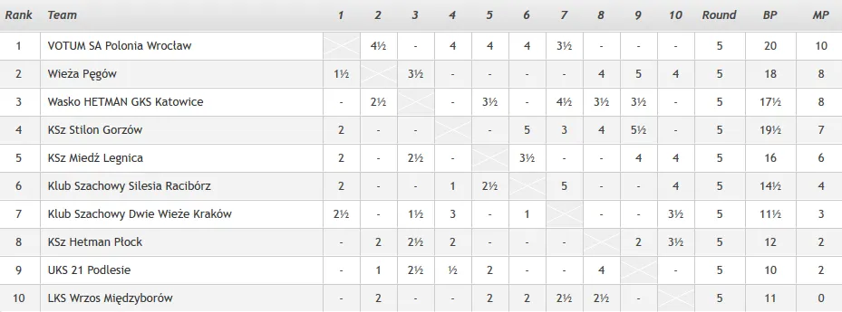 Wieża Pęgów - VOTUM SA Polonia Wrocław 1,5 - 4,5 Moranda Wojciech - Harikrishna Pentala 1/2 Bartel Mateusz - Dziuba Marcin 1/2 Hnydiuk Aleksander - Gumularz Szymon 0-1 Tazbir Marcin - Zilka Stepan 1/2 Plat Vojtech - Wieczorek Oskar 0-1 Zawadzka Jolanta - Majdan Joanna 1-0 Partie polonistów z 5. rundy: 1. d4 d5 2. c4 c6 3. Nc3 Nf6 4. e3 e6 5. Nf3 Nbd7 6. Bd3 dxc4 7. Bxc4 b5 8. Bd3 Bd6 9. O-O O-O 10. Qc2 Bb7 11. Ng5 h6 12. Nge4 Be7 13. Rd1 Qb6 14. Nxf6+ Nxf6 15. Qe2 Rfd8 16. b3 a6 17. a4 c5 18. axb5 cxd4 19. Na4 Qa7 20. b6 Qb8 21. Bb2 dxe3 22. Qxe3 Ng4 23. Qg3 Qxg3 24. hxg3 Bf6 25. Bxf6 Nxf6 26. Nc5 Rdb8 27. Bc4 a5 28. Rd6 1/2-1/2 1. e4 c5 2. Nf3 Nc6 3. Bb5 g6 4. O-O Bg7 5. Re1 e5 6. a3 Nge7 7. b4 d6 8. c3 O-O 9. d3 a6 10. Bc4 b5 11. Bb3 cxb4 12. axb4 Bb7 13. Be3 h6 14. Nbd2 Kh7 15. d4 exd4 16. Nxd4 Rc8 17. N2f3 Ne5 18. Nxe5 dxe5 19. Ne2 Qc7 20. Bc5 Rfd8 21. Qc2 Ng8 22. Qa2 Rd7 23. Rad1 Rcd8 24. Rxd7 Rxd7 25. Ng3 Nf6 26. f3 Kg8 27. Qe2 1/2-1/2 1. Nf3 d6 2. d4 Nf6 3. c4 g6 4. g3 Bg7 5. Bg2 O-O 6. Nc3 Nc6 7. O-O e5 8. dxe5 dxe5 9. Bg5 Be6 10. Qa4 Qc8 11. Bxf6 Bxf6 12. Nd2 Bg7 13. Nde4 f5 14. Nc5 e4 15. Rfd1 Re8 16. Nd5 Ne5 17. Qb3 Bf7 18. Qxb7 Nxc4 19. Rac1 Nxb2 20. Rd2 Qxb7 21. Nxb7 Nd3 22. Rxc7 Bxd5 23. exd3 Rac8 24. Rd7 Rc1+ 25. Bf1 e3 26. fxe3 Bh6 27. Rxd5 Bxe3+ 28. Kg2 Bxd2 29. d4 Bb4 30. Bb5 Rc2+ 31. Kh3 Re1 32. g4 0-1 1. Nf3 d5 2. g3 c5 3. Bg2 Nc6 4. O-O e5 5. c4 d4 6. d3 Nf6 7. a3 a5 8. e3 Be7 9. exd4 exd4 10. Re1 O-O 11. Ne5 Nxe5 12. Rxe5 Bd6 13. Re1 Bg4 14. Bf3 Re8 15. Rxe8+ Qxe8 16. Bxg4 Nxg4 17. Qxg4 Qe1+ 18. Kg2 Qxc1 19. Qe2 Ra6 20. Qd2 Qxd2 21. Nxd2 f5 22. h4 a4 23. Rb1 Bc7 24. b3 axb3 25. Nxb3 Bd6 26. Ra1 Ra4 27. Nc1 h6 28. h5 b6 29. Kf3 Kf7 30. Ne2 Kf6 31. Nf4 Kg5 32. Ne6+ Kf6 33. Nf4 Kg5 34. Ne6+ Kf6 1/2-1/2 1. d4 Nf6 2. Nf3 g6 3. c4 Bg7 4. g3 c5 5. Bg2 O-O 6. O-O cxd4 7. Nxd4 d5 8. cxd5 Nxd5 9. Nb5 Be6 10. Bxd5 Bxd5 11. N1c3 e6 12. Nxd5 exd5 13. Bf4 Nc6 14. Qd2 a6 15. Nc3 d4 16. Na4 Re8 17. Rfe1 Bf8 18. a3 b5 19. Rac1 Ne5 20. Rc5 Bxc5 21. Nxc5 Nc4 22. Qb4 Qd5 23. b3 Ne5 24. Bxe5 Rxe5 25. Nd3 a5 26. Qd2 Ree8 27. Rb1 Qe4 28. Rb2 Rec8 29. Nf4 Rc3 30. f3 Qe5 31. Kf2 Qe3+ 32. Qxe3 dxe3+ 33. Kf1 a4 34. bxa4 bxa4 35. Ra2 Rb8 36. Nd5 Rc1+ 37. Kg2 Rb3 38. f4 f5 39. Nb4 Rcc3 40. Nc2 Kf7 41. Kf3 Rb1 42. Nd4 Rd1 43. Nb5 Rb3 44. Na7 Rf1+ 45. Kg2 Rc1 0-1 1. e4 c5 2. Nf3 Nc6 3. d4 cxd4 4. Nxd4 e5 5. Nb5 d6 6. c4 Be7 7. N1c3 a6 8. Na3 Be6 9. Nc2 Rc8 10. Be2 Nf6 11. O-O O-O 12. Bd2 Nd4 13. Nxd4 exd4 14. Nd5 Bxd5 15. exd5 Qb6 16. Bd3 Rfe8 17. b3 Nd7 18. Bf5 Rcd8 19. Re1 g6 20. Bxd7 Rxd7 21. Re4 Rc8 22. Qe2 Qd8 23. Re1 Bf6 24. Qd3 Kg7 25. Bc1 b5 26. cxb5 Rc3 27. Qd2 Be5 28. bxa6 Rdc7 29. Qh6+ Kg8 30. Bd2 Rc2 31. Bg5 f6 32. f4 Rxa2 33. fxe5 Rcc2 34. exf6 1-0 Wyniki rundy 5 Klub Szachowy Dwie Wieże Kraków – KSz Stilon Gorzów Wlkp. 3 - 3 KSz Miedź Legnica – Klub Szachowy Silesia Racibórz 3,5 - 2,5 Wieża Pęgów – VOTUM SA Polonia Wrocław 1,5 -4,5 KSz Hetman Płock – LKS Wrzos Międzyborów 3,5 - 2,5 UKS 21 Podlesie – Wasko HETMAN GKS Katowice 2,5 - 3,5 Tabela po 5 rundach:
