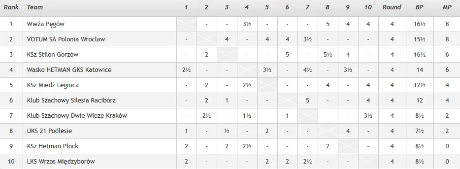 VOTUM SA Polonia Wrocław - KSz Miedź Legnica 4 - 2 Harikrishna Pentala - Kempiński Robert 1/2 Heberla Bartłomiej - Bartel Mateusz 1/2 Gumularz Szymon - Olszewski Michał 1-0 Bobras Piotr - Tazbir Marcin 1/2 Wieczorek Oskar - Murdzia Piotr 1/2 Kiołbasa Oliwia - Zawadzka Jolanta 0-1 Partie polonistów z 4. rundy: 1. d4 Nf6 2. c4 e6 3. Nf3 Bb4+ 4. Nbd2 O-O 5. g3 c5 6. dxc5 Bxc5 7. Bg2 Nc6 8. O-O b6 9. a3 a5 10. Nb3 Ba6 11. Nxc5 bxc5 12. Bg5 h6 13. Bxf6 Qxf6 14. Qxd7 Rac8 15. Qd2 Bxc4 16. Rfe1 Bb3 17. Rac1 1/2-1/2 1. c4 b6 2. Nc3 Bb7 3. e4 e5 4. d3 Bc5 5. a3 a5 6. Nf3 Nc6 7. Nxe5 Nxe5 8. d4 Bd6 9. dxe5 Bxe5 10. Qc2 Nf6 11. f3 O-O 12. Be3 c6 13. O-O-O d5 14. c5 d4 15. Bg5 h6 16. Bh4 Qc7 17. cxb6 Qe7 18. Nb1 c5 19. Nd2 Qe6 20. Bxf6 Qxf6 21. Nc4 Bxh2 22. Kb1 Bg3 23. Bd3 Ba6 24. Rh3 Bf4 25. g3 Bxc4 26. Bxc4 Be3 27. f4 Qxb6 28. e5 Rab8 29. Rh2 Rb7 30. Qf5 Re8 31. Re1 Kf8 32. e6 Rxe6 33. Bxe6 Qxe6 34. Qxe6 fxe6 35. Rc2 d3 36. Rxe3 dxc2+ 37. Kxc2 Kf7 38. Re5 Rc7 39. Kb3 Kf6 40. Ka4 c4 41. Re3 Rb7 42. Re2 Rb3 43. Kxa5 c3 44. bxc3 Rxc3 45. a4 Rxg3 46. Kb4 Rg1 47. a5 Rb1+ 48. Kc5 Ra1 49. Kb6 g5 50. fxg5+ hxg5 51. Rf2+ 1/2-1/2 1. e4 e5 2. Nf3 Nc6 3. Bc4 Nf6 4. d3 Be7 5. O-O O-O 6. Re1 d6 7. a4 Na5 8. Ba2 c5 9. Na3 Nc6 10. c3 h6 11. Bd2 Re8 12. Nc2 Bf8 13. b4 cxb4 14. cxb4 Be6 15. b5 Bxa2 16. Rxa2 Ne7 17. Ne3 Ng6 18. Qb3 d5 19. Nxd5 Nxd5 20. exd5 Qd7 21. h4 Rad8 22. h5 Nf4 23. Nxe5 Qxd5 24. Qxd5 Nxd5 25. Nf3 Rxe1+ 26. Nxe1 Nf6 27. Rc2 Bd6 28. Be3 Bb8 29. Rc5 Kf8 30. Kf1 Ke7 31. Ke2 Rd5 32. Rc8 Rd8 33. Rc5 b6 34. Rc4 Nxh5 35. Nc2 Kd7 36. Nb4 Bd6 37. Nc6 Ra8 38. Kf3 Bc7 39. Bd4 f5 40. g4 fxg4+ 41. Kxg4 Nf4 42. Be5 Ne6 43. f4 Bxe5 44. Nxe5+ Kd6 45. Rc6+ Kd5 46. Nc4 Nf8 47. Rxb6 axb6 48. Nxb6+ Kc5 49. Nxa8 Kb4 50. b6 Ka5 51. b7 Nd7 52. Nc7 Kb6 53. Ne6 Kxb7 54. Nxg7 Nc5 55. d4 Nxa4 56. f5 Kc6 57. f6 Kd6 58. Kh5 Nb6 59. Kxh6 Nd7 60. Kg6 Kd5 61. Nf5 Ke4 62. f7 Nf8+ 63. Kf6 Nh7+ 64. Ke7 Kxf5 65. d5 1-0 1. e4 e6 2. d4 d5 3. Nc3 dxe4 4. Nxe4 Bd7 5. Nf3 Bc6 6. Bd3 Nd7 7. O-O Ngf6 8. Ng3 g6 9. b3 Bg7 10. Ba3 Bf8 11. Bb2 Bg7 12. Ba3 Bf8 1/2-1/2 1. e4 e5 2. Nf3 Nc6 3. Bb5 a6 4. Ba4 Nf6 5. O-O Be7 6. Re1 b5 7. Bb3 d6 8. c3 O-O 9. h3 Na5 10. Bc2 c5 11. d4 Nd7 12. Nbd2 exd4 13. cxd4 Nc6 14. d5 Nce5 15. a4 Rb8 16. Nxe5 Nxe5 17. axb5 axb5 18. f4 Ng6 19. Nf3 Bh4 20. Nxh4 Qxh4 21. f5 Ne5 22. Rf1 b4 23. Bf4 Qe7 24. Qe2 f6 25. Ra5 b3 26. Bb1 Bd7 27. Bd2 Ra8 28. Bd3 Rxa5 29. Bxa5 Bxf5 30. exf5 Qa7 31. Bc3 c4+ 32. Kh1 cxd3 33. Qe4 Qa6 34. Rd1 Re8 35. Bxe5 Rxe5 36. Qxd3 Qxd3 37. Rxd3 Rxf5 38. Rxb3 Rxd5 39. Rb7 h5 40. b4 Rd1+ 41. Kh2 h4 42. b5 Kh7 43. Rd7 Rb1 44. Rxd6 Rxb5 45. Kg1 Rb2 46. Rd7 Kh6 47. Rd4 g5 48. Rd5 Re2 49. Kf1 Re5 50. Rd4 Kg6 51. Kf2 Kf5 52. Kf3 Ra5 53. Rd3 Ra4 54. Rd5+ Ke6 55. Rb5 Rf4+ 56. Ke3 Rf5 57. Rb6+ Kf7 58. Ra6 Kg6 59. Ra3 Rf1 60. Ke2 Rf4 61. Ra5 Rb4 62. Kf3 Rb6 63. Rc5 f5 64. Ra5 Rb3+ 65. Kf2 Rc3 66. Rb5 Kf6 67. Ra5 Ke6 68. Rb5 g4 69. hxg4 fxg4 70. Rh5 Rc2+ 71. Ke3 Rxg2 1/2-1/2 1. e4 e5 2. Nf3 Nc6 3. Bb5 f5 4. d3 fxe4 5. dxe4 Nf6 6. O-O d6 7. Nc3 Be7 8. a4 Bg4 9. Qd3 Qd7 10. Nd5 O-O 11. h3 Bxf3 12. Qxf3 a6 13. Nxe7+ Qxe7 14. Bc4+ Kh8 15. c3 Nd8 16. Qe2 Ne6 17. g3 c6 18. Bd3 Qf7 19. a5 Qg6 20. b4 Rf7 21. Kh2 Raf8 22. Ra2 Nh5 23. Rg1 Ng5 24. Bxg5 Qxg5 25. Rg2 Rf3 26. Rd2 Qh6 27. c4 g5 28. Kg1 Ng7 29. Rh2 Ne6 30. Qd1 Qf6 31. Qe1 Nd4 32. Be2 Rc3 33. Qd1 c5 34. bxc5 dxc5 35. Rg2 Qc6 36. Bd3 Nf3+ 37. Kf1 Qd7 38. Ke2 Nxd2 39. Qxd2 Qd4 40. g4 Rf3 0-1 Wyniki rundy 4 KSz Stilon Gorzów Wlkp. – UKS 21 Podlesie 5,5 - 0,5 Wasko HETMAN GKS Katowice – KSz Hetman Płock 3,5 - 2,5 LKS Wrzos Międzyborów – Wieża Pęgów 2 - 4 VOTUM SA Polonia Wrocław – KSz Miedź Legnica 4 - 2 Klub Szachowy Silesia Racibórz – Klub Szachowy Dwie Wieże Kraków 5 - 1 Tabela po 4 rundach: