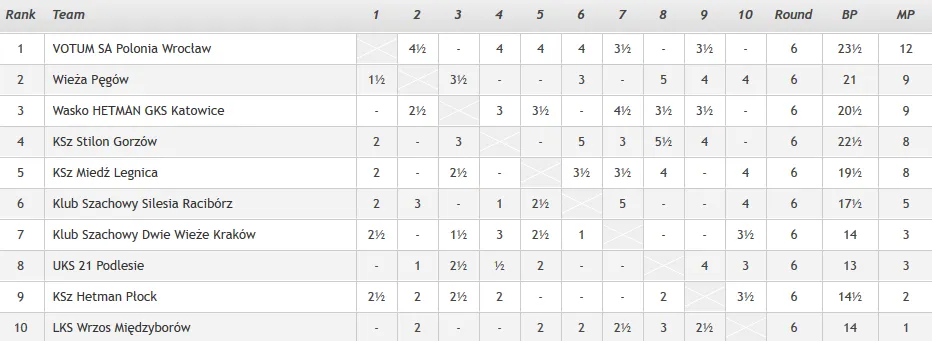 VOTUM SA Polonia Wrocław - KSz Hetman Płock 3,5 - 2,5 Harikrishna Pentala - Golubka Petro 1/2 Pultinevicius Paulius - Bartel Mateusz 0-1 Gumularz Szymon - Warakomski Tomasz 1/2 Grabarczyk Mirosław - Tazbir Marcin 1/2 Wieczorek Oskar - Sabuk Piotr 1-0 Bulmaga Irina - Zawadzka Jolanta 1-0 Partie polonistów z 6. rundy: 1. e4 e5 2. Nf3 Nc6 3. Bb5 a6 4. Ba4 d6 5. O-O Bd7 6. c3 g6 7. d4 Bg7 8. Re1 Nge7 9. Be3 O-O 10. dxe5 Nxe5 11. Nxe5 Bxe5 12. Nd2 Bxa4 13. Qxa4 Qe8 14. Qc2 Bg7 15. Nf3 Nc6 16. a4 Ne5 17. Nd4 Qd7 18. Rad1 b5 19. axb5 axb5 20. b3 Rfe8 21. f4 Ng4 22. Bc1 c6 23. h3 Nf6 24. Nf3 Qc7 25. c4 bxc4 26. bxc4 Rad8 27. Bb2 Nh5 28. Bxg7 Nxg7 29. Qf2 d5 30. e5 Ne6 31. cxd5 cxd5 32. Nh2 Qc5 33. Qxc5 Nxc5 34. Ng4 Ne4 35. Rd4 Kg7 36. Ne3 Nc3 37. Kh2 h5 38. Rd3 d4 39. Nc4 Rd5 40. Nd2 Red8 41. Nf3 Na4 42. e6 Nc5 43. Rxd4 Nxe6 44. Rb4 Nd4 45. Rxd4 Rxd4 46. Nxd4 Rxd4 47. Kg3 Ra4 48. Re3 Rb4 49. Kf3 Ra4 50. g4 hxg4+ 51. hxg4 Rb4 52. Re4 Rb3+ 53. Re3 Rb7 54. Ra3 Rb4 55. Kg3 Rc4 56. Rb3 Ra4 57. Rc3 Rb4 58. Ra3 Rc4 59. Rb3 Ra4 60. Rc3 Rb4 1/2-1/2 1. d4 d5 2. c4 c6 3. Nf3 Nf6 4. e3 Bf5 5. Nc3 e6 6. Bd3 Bg6 7. O-O Nbd7 8. cxd5 exd5 9. Qc2 Bd6 10. Re1 O-O 11. Bxg6 hxg6 12. e4 dxe4 13. Nxe4 Nxe4 14. Qxe4 Re8 15. Qxe8+ Qxe8 16. Rxe8+ Rxe8 17. Bd2 Nb6 18. Kf1 f6 19. Re1 Rd8 20. Ba5 Kf7 21. Nd2 Be7 22. Nb3 Rd5 23. Bxb6 axb6 24. a4 f5 25. Ke2 Bf6 26. Rd1 Rd8 27. a5 Rd5 28. axb6 Rb5 29. Rd3 Rxb6 30. Kd2 Rb5 31. Kc2 Rd5 32. Rd1 Ke7 33. f3 Kd6 34. Rd3 Rb5 35. Nc1 Ra5 36. Nb3 Ra4 37. Nc5 Rc4+ 38. Rc3 b5 39. Nb3 Kd5 40. Rxc4 bxc4 41. Nd2 Kxd4 42. f4 Kd5 43. Nf3 Ke4 44. Nd2+ Kxf4 45. Nxc4 Ke4 46. Kd2 Kd4 47. Na5 Kc5 48. b3 Be5 49. h3 Bc7 50. Nc4 Kd4 51. Kc2 g5 52. Kd2 g6 53. Kc2 Bd8 54. Kd2 Be7 55. Ke2 Bb4 56. Kd1 Kc3 57. Ne5 c5 58. Nxg6 Kxb3 59. Ne7 f4 60. Nd5 Kc4 61. Nf6 Kd3 62. Nd5 Bd2 63. Ne7 Bc3 64. Ng6 Ke3 65. Kc2 Bf6 66. Kd1 Kf2 67. h4 Kxg2 68. hxg5 Bxg5 0-1 1. d4 d5 2. c4 c6 3. Nc3 Nf6 4. cxd5 cxd5 5. Bf4 Nc6 6. e3 Bf5 7. Qb3 Na5 8. Qa4+ Bd7 9. Qc2 Rc8 10. Bd3 Nc6 11. a3 Bg4 12. Nge2 e6 13. Ng3 Bh5 14. Nxh5 Nxh5 15. Be5 Nf6 16. Qb3 Nxe5 17. dxe5 Nd7 18. Qxb7 Rc7 19. Qa6 Nxe5 20. Qa4+ Nd7 21. e4 dxe4 22. Bb5 f5 23. Rd1 Bc5 24. Rxd7 Rxd7 25. Qc4 Bxf2+ 26. Kxf2 Qb6+ 27. Kf1 Ke7 28. Bxd7 Kxd7 29. Na4 Qd6 30. Qb5+ Ke7 31. Qc5 Rc8 32. Qxd6+ Kxd6 33. Nc3 Rb8 34. Nd1 Rc8 35. Nc3 Rb8 36. Nd1 Rc8 37. Nc3 1/2-1/2 1. d4 Nf6 2. c4 g6 3. Nf3 Bg7 4. g3 O-O 5. Bg2 d6 6. Nc3 Nbd7 7. O-O e5 8. e4 c6 9. h3 Qa5 10. Be3 b5 11. cxb5 cxb5 12. a3 b4 13. axb4 Qxb4 14. Qc2 a5 15. Ra4 Qb8 16. dxe5 dxe5 17. Rfa1 Qc7 18. Nd2 Nb6 19. Rxa5 Rxa5 20. Rxa5 Be6 21. Rc5 Qd8 22. Nb5 Nfd7 23. Rc6 Na8 24. Qa4 Qb8 25. Qa6 Nf6 26. Bc5 Rc8 27. Bd6 Rxc6 28. Qxc6 Qe8 29. Qxe8+ Nxe8 30. Bb8 Nb6 31. Nc7 Nxc7 32. Bxc7 Na4 33. b4 Bh6 34. Nb1 Ba2 35. Na3 Bf8 36. Ba5 Nc3 37. Bf1 Nxe4 38. Bc4 Nc3 39. Ba6 Nd5 40. Bc4 Nxb4 41. Bxb4 Bxb4 42. Bxa2 Bxa3 43. f3 Kg7 44. Kf2 Bc1 45. Bc4 f5 46. Bd5 Kf6 47. Bg8 Ba3 48. f4 Bc5+ 49. Ke2 e4 50. h4 h6 51. Bc4 g5 52. hxg5+ hxg5 53. fxg5+ Kxg5 54. Kf1 Kf6 55. Ba6 Ke5 56. Bc8 Bb6 57. Bd7 Kf6 58. Bb5 f4 1/2-1/2 1. e4 e6 2. d4 d5 3. Nc3 Bb4 4. e5 c5 5. a3 Bxc3+ 6. bxc3 Ne7 7. Qg4 cxd4 8. Qxg7 Rg8 9. Qxh7 Qc7 10. Ne2 Nbc6 11. h4 Bd7 12. f4 dxc3 13. h5 O-O-O 14. Qd3 Nf5 15. Rg1 Rg4 16. g3 a6 17. Bh3 Nxe5 18. Qxc3 Qxc3+ 19. Nxc3 Nf3+ 20. Kf2 Nxg1 21. Bxg4 Rg8 22. Bxf5 exf5 23. Nxd5 Nh3+ 24. Kg2 Bc6 25. c4 Rh8 26. Kxh3 Rxh5+ 27. Kg2 b5 28. Kg1 Kd8 29. Be3 bxc4 30. Rd1 Rh3 31. Nb4+ 1-0 1. e4 e5 2. Nf3 Nf6 3. d4 Nxe4 4. Bd3 Nc6 5. O-O d5 6. dxe5 Bg4 7. Nc3 Nxc3 8. bxc3 Be7 9. Re1 O-O 10. h3 Bh5 11. Rb1 Rb8 12. Rb5 Kh8 13. Bf5 d4 14. g4 Bg6 15. Nxd4 Nxd4 16. Qxd4 Bxf5 17. gxf5 Qc8 18. Qe4 c6 19. Rb3 Qc7 20. c4 Qa5 21. Rg3 Rbd8 22. Bb2 Rg8 23. Bc3 Bb4 24. Bxb4 Qxb4 25. e6 Qe7 26. Rd3 g6 27. Rxd8 Rxd8 28. fxg6 fxe6 29. gxh7 Re8 30. Re3 e5 31. Kh1 Qxh7 32. f4 Qh5 33. fxe5 Rd8 34. Qg4 Qh6 35. Rg3 c5 36. e6 Re8 37. Qg6 Qxg6 38. Rxg6 Kh7 39. Rf6 b6 40. a4 Kg7 41. Rf7+ Kg6 42. Rxa7 Rxe6 43. a5 bxa5 44. Rxa5 Re5 45. Kg2 Kf6 46. Kf3 Rf5+ 47. Ke4 Re5+ 48. Kd3 Rh5 49. Kd2 Rxh3 50. Rxc5 Ke6 51. Rd5 Rg3 52. Rd3 Rg8 53. Kc3 Rc8 54. Rd5 Rb8 55. Kd4 Rh8 56. Kc5 Rc8+ 57. Kb4 Rb8+ 58. Rb5 Rh8 59. Rb7 Rh2 60. Kb5 Rxc2 61. c5 Rc1 62. Kb6 Rb1+ 63. Kc7 Rc1 64. c6 Rh1 65. Rb2 Rc1 66. Rd2 Ke7 67. Re2+ Kf7 68. Kd7 Rd1+ 69. Kc8 Rc1 70. c7 Kf6 71. Re8 Kf7 72. Rd8 1-0 Wyniki rundy 6 KSz Stilon Gorzów Wlkp. – Wasko HETMAN GKS Katowice 3 - 3 LKS Wrzos Międzyborów – UKS 21 Podlesie 3 - 3 VOTUM SA Polonia Wrocław – KSz Hetman Płock 3,5 - 2,5 Klub Szachowy Silesia Racibórz – Wieża Pęgów 3 - 3 Klub Szachowy Dwie Wieże Kraków – KSz Miedź Legnica 2,5 - 3,5 Tabela po 6 rundach: