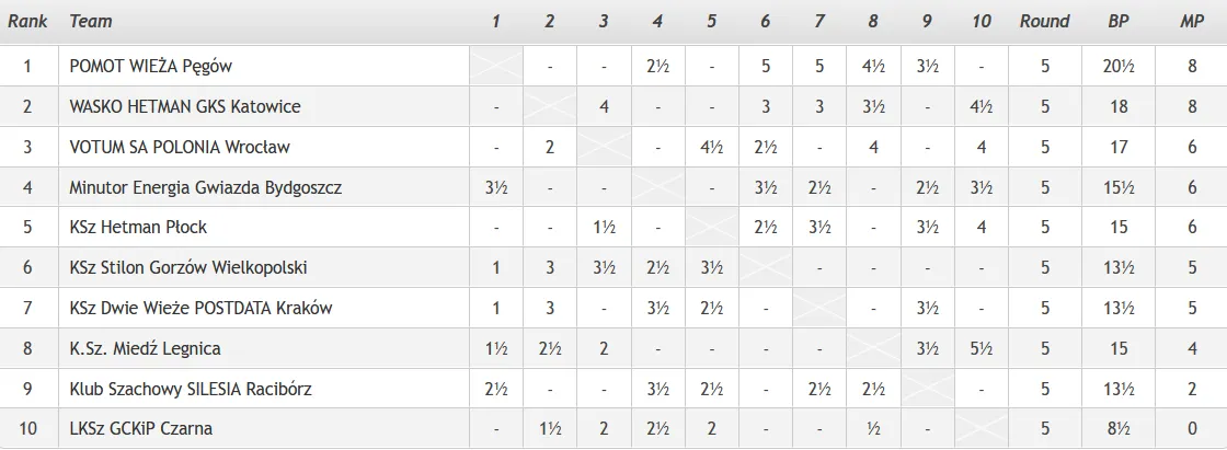 Wyniki rundy 5 LKSz GCKiP Czarna – KSz Miedź Legnica 0,5-5,5 KSz Stilon Gorzów Wielkopolski – VOTUM SA Polonia Wrocław 3,5-2,5 KSz Dwie Wieże POSTDATA Kraków – Wasko HETMAN GKS Katowice 3-3 Klub Szachowy Silesia Racibórz – KSz Hetman Płock 2,5-3,5 POMOT Wieża Pęgów – Minutor Energia Gwiazda Bydgoszcz 2,5-3,5 Tabela po 5 rundach: