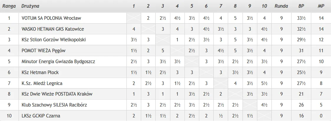 Wyniki rundy 9 KSz Dwie Wieże POSTDATA Kraków – KSz Miedź Legnica 2-4 Klub Szachowy Silesia Racibórz – KSz Stilon Gorzów Wielkopolski 2,5-3,5 POMOT Wieża Pęgów – LKSz GCKiP Czarna 4-2 Minutor Energia Gwiazda Bydgoszcz – VOTUM SA Polonia Wrocław 2,5-3,5 KSz Hetman Płock – Wasko HETMAN GKS Katowice 1,5-4,5 Tabela po końcowa: