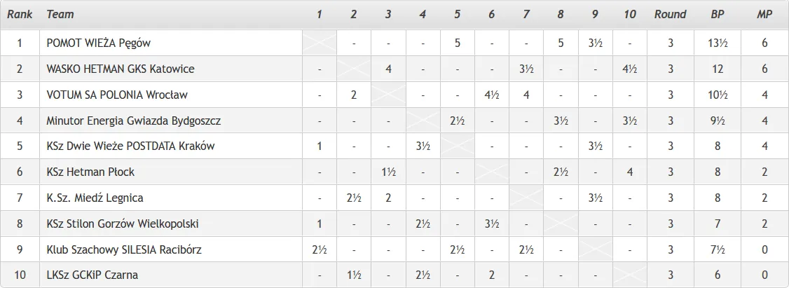 Wyniki rundy 3 VOTUM SA Polonia Wrocław – KSz Miedź Legnica 4-2 LKSz GCKiP Czarna – Wasko HETMAN GKS Katowice 1,5-4,5 KSz Stilon Gorzów Wielkopolski – KSz Hetman Płock 3,5-2,5 KSz Dwie Wieże POSTDATA Kraków – Minutor Energia Gwiazda Bydgoszcz 3,5-2,5 Klub Szachowy Silesia Racibórz – POMOT Wieża Pęgów 2,5-3,5 Tabela po 3 rundach: