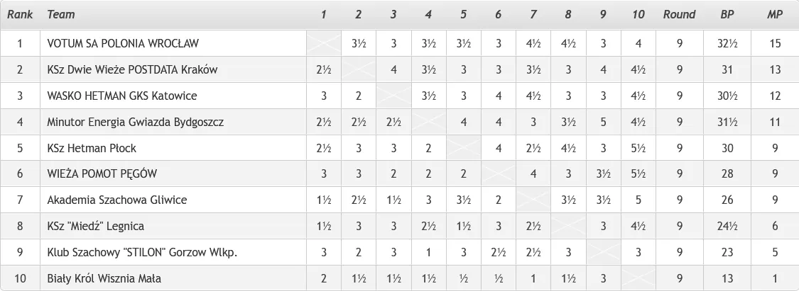 W dziewiątej rundzie Drużynowych Mistrzostw Polski – Ekstraliga 2022, wygrywamy z Białym Królem Wisznia Mała i zostajemy po raz trzeci raz z rzędu MISTRZAMI POLSKI! W ostatniej rundzie Ekstraligi (Bydgoszcz, 2-11.09.2022) pokonujemy Białego Króla Wisznia Mała 4-2 i po raz trzeci raz z rzędu zostajemy DRUŻYNOWYMI MISTRZAMI POLSKI! Dla VOTUM SA Polonii Wrocław jest to czwarty tytuł mistrzowski w historii ? Mistrzostwo kraju dla VOTUM SA Polonii Wrocław wywalczyli: