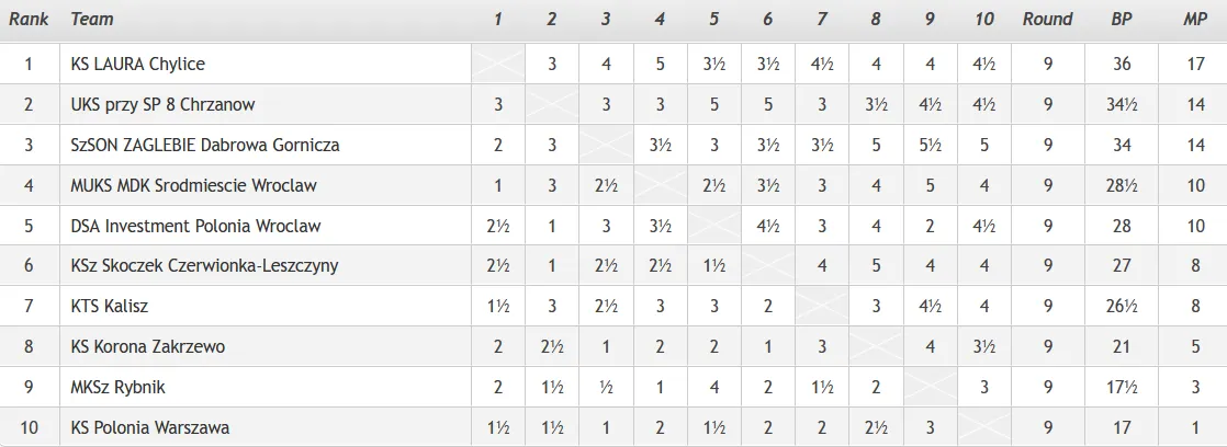 Ekstraliga i I Liga Juniorów zakończone! Zakończyły się Drużynowe Mistrzostwa Polski Juniorów - Ekstraliga i I Liga! Mistrzostwa zostały rozegrane w Lublinie - w dniach 25.06-4.07.2021! W ostatniej rundzie obie nasze ekipy wygrały i to w prestiżowych meczach. W Ekstralidze pokonaliśmy LKSz GCKiP Czarną 3,5-2,5, która mimo porażki została Drużynowym Mistrzem Polski (trzeci raz z rzędu). Ostatecznie ligę kończymy na 4. miejscu z bilansem 12 pkt (5 zwycięstw, 2 remisy, 2 porażki) W I lidze w ostatniej rundzie nasza druga drużyna pokonuje rywala zza miedzy, czyli MUKS MDK Śródmieście Wrocław 3,5-2,5 :) i mistrzostwa kończymy na 5. miejscu z 10 pkt (4 zwycięstwa, 2 remisy, 3 porażki). Trenerami naszych drużyn byli Marcin Tazbir, Oskar Wieczorek i Mirosław Perdek! Dodatkowe podziękowania należą się Marcinowi (za pisanie relacji i przesyłanie zdjęć) oraz Oskarowi (za pisanie relacji). Ekstraliga Juniorów LKSz GCKiP Czarna – VOTUM SA Polonia Wrocław 2,5 – 3,5 Miś Mieszko – Luberański Jakub 0-1 Czopor Maciej – Chyży Jakub 1-0 Sowiński Paweł – Madej Marek 1-0 Grot Błażej – Krawczyk Flawian 1/2 Wikar Martyna – Harazińska Magdalena 1-0 Śmietańska Wiktoria – Pawicka Magdalena 1-0 Wyniki indywidualne: