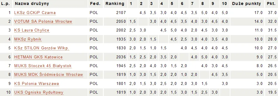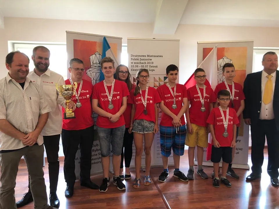 VOTUM SA Polonia Wrocław, (od lewej): Artur Jakubiec (wiceprezes PZSZach), Marcin Tazbir (trener), Mirosław Perdek (trener), Szymon Gumularz, Magdalena Harazińska, Magdalena Pawicka, Jakub Luberański, Maciej Czopor, Marek Madej, Szymon Starościak, Waldemar Cieślak (dyrektor turnieju), fot. Drużynowe Mistrzostwa Polski Juniorów w Szachach 2019 - facebook MKSz Rybnik - VOTUM SA Polonia Wrocław 2 - 4 Nowak Mikołaj - Gumularz Szymon 1/2 Czopor Maciej - Posłuszny Tomasz 1/2 Seeman Jakub - Luberański Jakub 0-1 Madej Marek - Oleksy Krzysztof 1-0 Kucharska Honorata - Harazińska Magdalena 1-0 Pawicka Magdalena - Kucharska Helena 1-0 Wyniki 9. rundy: HETMAN GKS Katowice - KS Polonia Warszawa 4 - 2 KSz Stilon Gorzów Wlkp. - KS Laura Chylice 1 - 5 LKSz GCKiP Czarna - MUKS MDK Śródmieście Wrocław 5 - 1 MKSz Rybnik - VOTUM SA Polonia Wrocław 2 - 4 UKS Ognisko Rydułtowy - MUKS Stoczek 45 Białystok 1,5 - 4,5 Tabela końcowa: