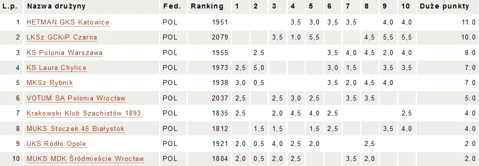 W końcu! Po pięciu rundach Ekstraligi Juniorów bez zwycięstwa możemy napisać: WYGRALIŚMY MECZ! W szóstej rundzie, w bardzo ważnym meczu, pokonujemy MUKS Stoczek 45 Białystok 3,5-2,5! Tak jest! Szósta runda Ekstraligi Juniorów przynosi nam upragnione zwycięstwo, które jest ważnym krokiem do utrzymania się w lidze (niestety taki cel nam aktualnie przyświeca). Zwycięstwo 3,5-2,5 z MUKS Stoczek 45 Białystok pozwala nam trochę spokojniej patrzeć w tabelę, ponieważ aktualnie mamy 3 pkt przewagi nad strefą spadkową, ale i... tracimy tylko 3 pkt do strefy medalowej, więc może jednak :) Co prawda, z przebiegu meczu nasze zwycięstwo powinno, być bardziej okazałe, ale już się chyba przyzwyczailiśmy, że nasi zawodnicy lubią emocjonujące mecze i bardzo w tym pomagają, aby takie były ;) Szczególnie szkoda partii Michała i Kuby, którzy mieli świetne pozycje... ale wynik drużyny jest najważniejszy, a on się zgadza :) Punkty dla VOTUM SA Polonii Wrocław zdobyli: Maciej Czopor (który wrócił do składu po kontuzji), Magdalena Pawicka (oboje zwycięstwa), Szymon Gumularz, Jakub Luberański, Magdalena Harazińska (wszyscy remis), przegrał Michał Fiedorek. W 7. rundzie zagramy z wiceliderem - LKSz GCKiP Czarna. Trzymamy kciuki za kolejne zwycięstwo! MUKS Stoczek Białystok - VOTUM SA Polonia Wrocław 2,5 - 3,5 Kosakowski Jakub - Gumularz Szymon 1/2 Czopor Maciej - Pytel Maciej 1-0 Karolczuk Iwo - Fiedorek Michał 1-0 Luberański Jakub - Szydło Michał 1/2 Koruch Maria - Harazińska Magdalena 1/2 Pawicka Magdalena - Arciszewska Zuzanna 1-0 Pozostałe wyniki 6 rundy: MUKS MDK Śródmieście Wrocław - KS Laura Chylice 2,5 - 3,5 MKSz Rybnik - HETMAN GKS Katowice 3 - 3 KS Polonia Warszawa - Krakowski Klub Szachowy 1893 4 – 2 LKSz GCKiP Czarna - UKS Rodło Opole 5,5 - 0,5 Tabela po 6. rundach