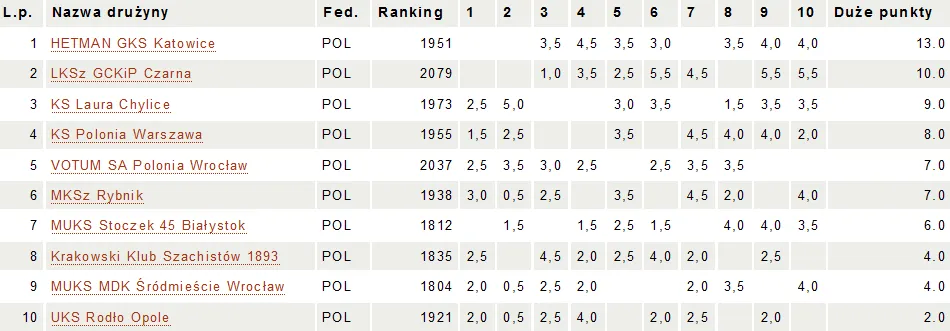 Po zwycięstwie w 6. rundzie Ekstraligi Juniorów przyszła chwila na kolejne zwycięstwo w 7. rundzie! VOTUM SA Polonia Wrocław pokonuje LKSz GCKiP Czarna 3,5-2,5! Lokomotywa pod nazwą VOTUM SA Polonia Wrocław się rozpędza! Odnosimy drugie zwycięstwo z rzędu i to z wiceliderem LKSz GCKiP Czarna! Oczywiście, wynik nie mógł być inny niż typowe dla naszej ekipy 3,5-2,5 (jakżeby inaczej) :) Epickie zwycięstwo odniósł Szymon Gumularz, u którego w partii, dosyć szybko króle obu stron postanowiły aktywnie włączyć się do gry ;) Pewnie wygrał Michał Fiedorek, zremisowali Jakub Luberański, Magdalena Harazińska oraz po morderczej walce Maciej Czopor, który by wywalczyć decydującą "połówkę" o naszym zwycięstwie, grał ponad 6 godzin! Maciek bronił m. in. pozycję, gdzie miał wieże, a przeciwnik wieże i gońca, no i... obronił się nasz zawodnik :) Niestety, nie wyszła partia Magdalenie Pawickiej, która przegrała swój pojedynek. BRAWO DRUŻYNA! Po 7. rundach zajmujemy 5. miejsce, z 3 pkt przewagi nad strefą spadkową i 2 pkt straty do 3. miejsca :) W 8. rundzie zagramy z Mistrzem Polski z lat 2015-2016 UKS Rodło Opole. Trzymamy kciuki za trzecie zwycięstwo z rzędu! VOTUM SA Polonia Wrocław - LKSz GCKiP Czarna 3,5 - 2,5 Gumularz Szymon - Szpar Miłosz 1-0 Miś Mieszko - Czopor Maciej 1/2 Fiedorek Michał - Chyży Jakub 1-0 Czernek Tymon - Luberański Jakub 1/2 Harazińska Magdalena - Święch Joanna 1/2 Wikar Martyna - Pawicka Magdalena 1-0 Pozostałe wyniki 7 rundy: UKS Rodło Opole - MUKS MDK Śródmieście Wrocław 2 - 4 Krakowski Klub Szachowy 1893 - MUKS Stoczek 45 Białystok 2 - 4 HETMAN GKS Katowice - KS Polonia Warszawa 4,5 - 1,5 KS Laura Chylic - MKSz Rybnik 3,5 - 2,5 Tabela po 7. rundach