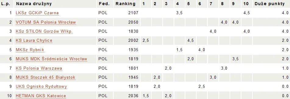 MUKS Stoczek 45 Białystok - VOTUM SA Polonia Wrocław 2 - 4 Kosakowski Jakub - Gumularz Szymon 1/2 Czopor Maciej - Pytel Maciej 1/2 Karolczuk Iwo - Luberański Jakub 1-0 Madej Marek - Budzisz Adrian 1-0 Koruch Maria - Harazińska Magdalena 0-1 Pawicka Magdalena - Szczotka Klara 1-0 Wyniki 2. rundy: KS Polonia Warszawa - KSz STILON Gorzów Wlkp. 2 - 4 LKSz GCKiP Czarna - HETMAN GKS Katowice 4,5 - 1,5 MKSz Rybnik - KS Laura Chylice 1,5 - 4,5 UKS Ognisko Rydułtowy - MUKS MDK Śródmieście Wrocław 2,5 - 3,5 MUKS Stoczek 45 Białystok - VOTUM SA Polonia Wrocław 2 - 4 Tabela po 2 rundach: