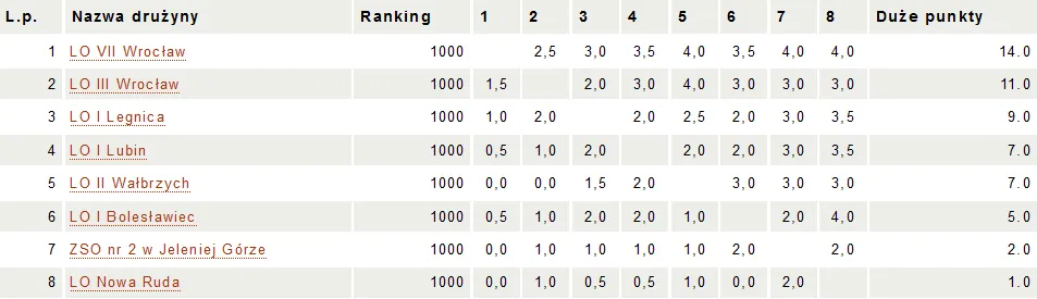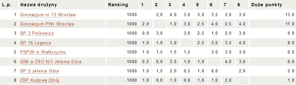 Pełne wyniki – TUTAJ Powiększenie zdjęcia, po kliknięciu na zdjęcie, fot. Adam Luberański FINAŁ DOLNOŚLĄSKI LICEALIADY MŁODZIEŻY - rocznik 1998 i młodsi W finale Dolnośląskiej Licealiady Młodzieży (szkoły podstawowe), startowało 8 najlepszych zespołów 4-osobowych z województwa dolnośląskiego. Drużyna nie mogła posiadać zawodników rezerwowych. Zawody były rozgrywane na dystansie 7 rund, granych tempem 15 minut na zawodnika. Poniżej wyniki zawodników MDK Fabryczna Polonia Wrocław.