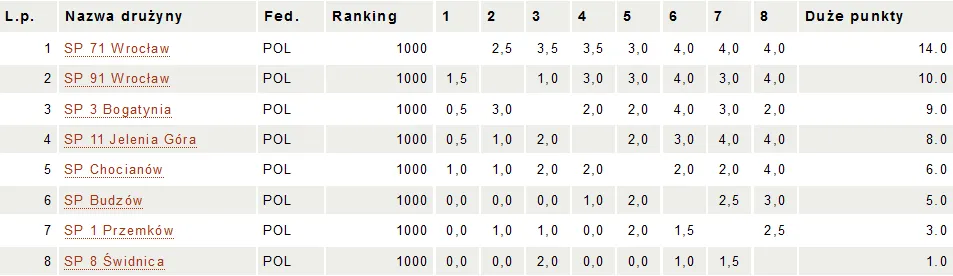 Pełne wyniki – TUTAJ Powiększenie zdjęcia, po kliknięciu na zdjęcie, fot. Adam Luberański FINAŁ DOLNOŚLĄSKI IGRZYSK MŁODZIEŻY - (klasy VII SP, klasy II i III szkół gimnazjalnych, rocznik 2002-2004) W finale Dolnośląskich Igrzysk Młodzieży (klasy VII SP, klasy II i III szkół gimnazjalnych), startowało 8 najlepszych zespołów 4-osobowych z województwa dolnośląskiego. Drużyna nie mogła posiadać zawodników rezerwowych. Zawody były rozgrywane na dystansie 7 rund, granych tempem 15 minut na zawodnika. Poniżej wyniki zawodników MDK Fabryczna Polonia Wrocław.