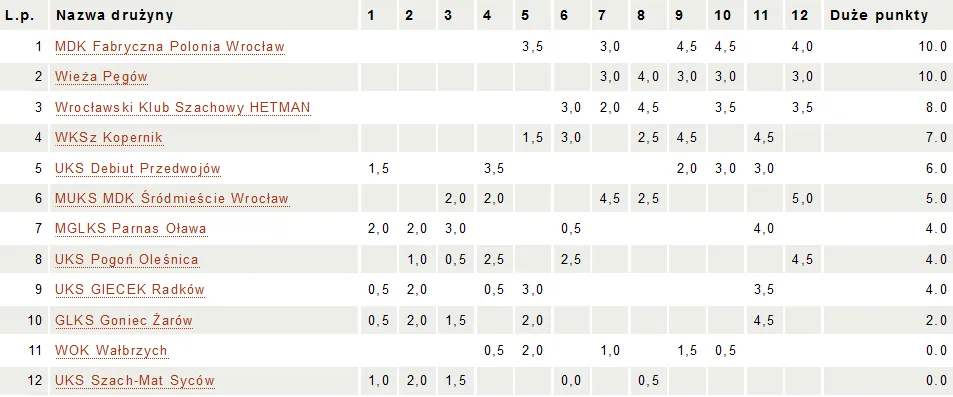 8 runda MDK Fabryczna Polonia Wrocław III - WKS Kopernik II 4,5 - 0,5 Nowakowski Artur - Somyk Marcin 1-0 Babijczuk Wojciech - Koza Stanisław 0-1 Rogacka Natalia - Starościak Adrian 1/2 Klamut Bartosz - Żerebiec Maurycy 0-1 Sierpowicz Konrad - Osmęda Daniel +/- MDK Fabryczna Polonia Wrocław II - WKS Kopernik III 4 - 1 Żochowski Janusz - Migdziński Krzysztof 1-0 Nęcki Jakub - Korolewicz Paweł 0-1 Krzysztofek Bogusław - Nęcki Cezary 0-1 Krygiel Konrad - Grot Błażej 0-1 Harazda Władysław - Denysów Damian 1-0 Pełne wyniki 8 rundy – TUTAJ 9 runda WKS Kopernik II - MDK Fabryczna Polonia Wrocław II 1 - 4 Somyk Marcin - Żochowski Janusz 0-1 Korolewicz Paweł - Babijczuk Wojciech 0-1 Starościak Adrian - Krzysztofek Bogusław 0-1 Grot Błażej - Klamut Bartosz +/- Osmęda Daniel - Harazda Władysław 0-1 WKS Kopernik III - MDK Fabryczna Polonia Wrocław III 2,5 - 2,5 Migdziński Krzysztof - Nowakowski Artur 1-0 Koza Stanisław - Nęcki Jakub 1-0 Nęcki Cezary - Rogacka Natalia 1-0 Żerebiec Maurycy - Krygiel Konrad 1/2 Denysów Damian - Sierpowicz Konrad 0-1 Pełne wyniki 9 rundy – TUTAJ Wyniki MDK Fabryczna Polonia Wrocław II – TUTAJ Wyniki MDK Fabryczna Polonia Wrocław III – TUTAJ