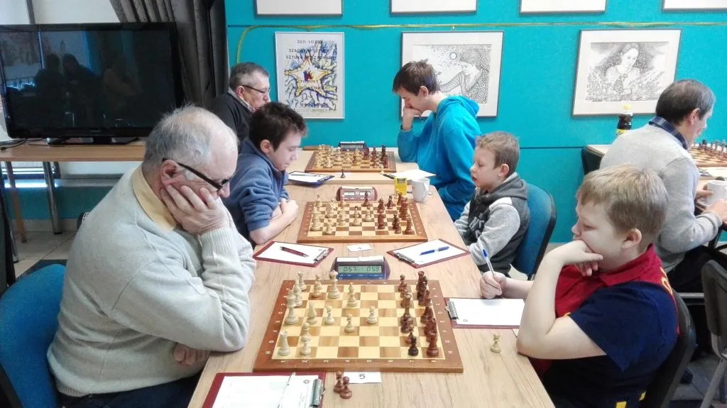 Mecz IV Ligi MDK Fabryczna Polonia Wrocław - WKS Kopernik, po lewej grający białymi Władysław Harazda, na drugiej szachownicy czarnymi gra Błażej Grot i pod ścianą białym kolorem gra Bogusław Krzysztofek, zdjęcie: Adam Luberański
