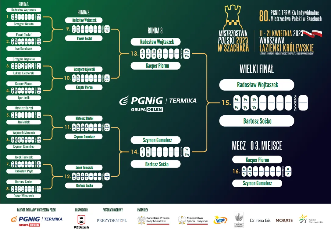 80. PGNiG TERMIKA Indywidualne Mistrzostwa Polski Mężczyzn Panowie po raz czwarty rozegrali mistrzostwa systemem pucharowym. Jak się okazuje po raz ostatni, ponieważ w przyszłym roku zostanie rozegrana kołówka (10 zawodników). W gronie 16 zawodników mieliśmy trzech zawodników Polonii Wrocław - Mateusza Bartla, Szymona Gumularza i Oskara Wieczorka. Prześledźmy wyniki polonistów: 1/8 finału