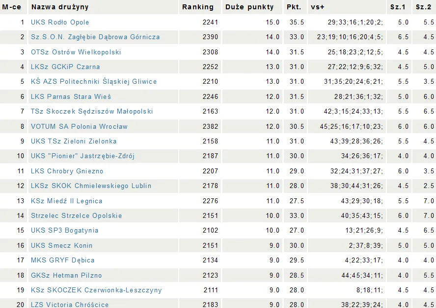 W ostatniej rundzie Drużynowych Mistrzostw Polski - II Liga 2019, wygrywamy ze Strzelcem Strzelce Opolskie 3,5-2,5! Miłym akcentem zakończyliśmy rozgrywki tegorocznej II Ligi! W ostatniej rundzie pokonaliśmy Strzelca Strzelce Opolskie 3,5-2,5 :) Nasza drużyna bojowo podeszła do dzisiejszego pojedynku (co wcześniej nie zawsze się udawało ;) ) o czym świadczy odrzucenie trzech propozycji remisowych (Dobrowolski, Piotrowski, Czyż), które otrzymali poloniści na początku partii i nie zawsze były to opłacalne decyzję ;) Była i czwarta propozycja remisowa, która została przyjęta przez sympatycznego Rysia Macioła :) Niestety, przegrywają Przemek Piotrowski oraz debiutujący w tegorocznej lidze Artur Czyż (którzy wykazali się chęcią gry, mimo wcześniejszych propozycji remisowych). Przy niekorzystnym dla nas wyniku 0,5-2,5 zaczynamy wreszcie punktować! Po ciężkim boju wygrywa Piotruś Dobrowolski. Następnie Kamil Stachowiak dokłada cały punkt i decydujący cios zadaje Agnieszka Dmochowska, która wygrywając swój pojedynek daje nam zwycięstwo w meczu :) Mimo zwycięstwa, nasza pozycja w tabeli nie uległa zmianie i zakończyliśmy rozgrywki II Ligi (Poronin, 6-15.09.2019), na 8. miejscu (na 45 drużyn) z dorobkiem 12 punktów (6 zwycięstw, 3 porażki). Wszystkim naszym zawodnikom, którzy wystąpili w barwach drugoligowej ekipy VOTUM SA Polonia Wrocław należą się brawa! Nie każdemu może wychodziło przy szachownicy, ale atmosfera w zespole była na pewno szampańska ;) Dziękujemy: Kamil Stachowiak (kapitan), Piotruś Dobrowolski, Przemek Piotrowski, Michał Fudalej, Rysiu Macioł, Krzyś Kolasiński, Artur Czyż oraz Agnieszka Dmochowska. Podziękowania także należą się za gościnny występ w naszej drużynie, naszej gwiazdy z ekstraligowej ekipy Polonii Wrocław, jaką był Marcin Tazbir! Szczególne podziękowania należą się rodzinie najpewniej grającego zawodnika w naszej drużynie - jakim był niewątpliwie Krzyś Kolasiński, a którzy byli na miejscu i wytrzymywali naszą rubaszną drużynę! Tymi osobami byli żona Krzysia, Marta i ich latorośl 5-miesięczny Jerzyk :) Dzięki!