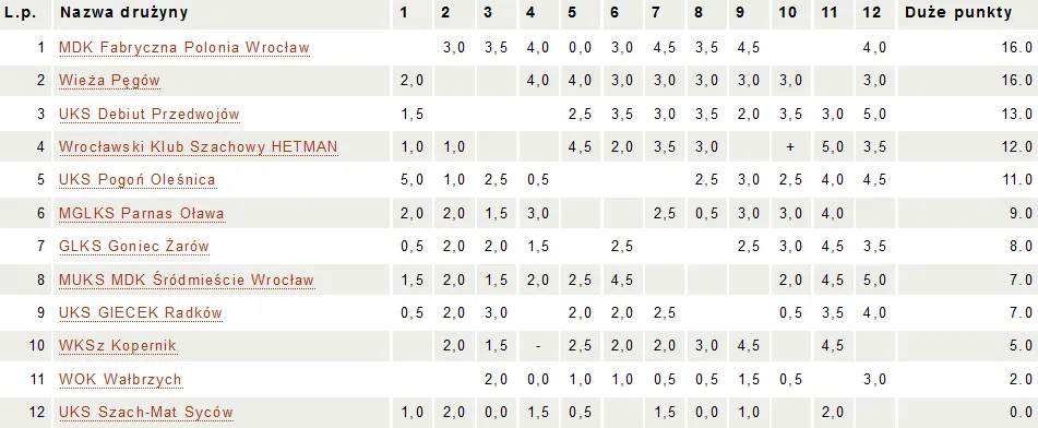 Po 8 rundach III Dolnośląskiej Ligi Szachowej nasz zespół MDK Fabryczna Polonia Wrocław miał na swoim koncie 7 zwycięstw i jedną porażkę, odniesioną w niecodziennych okolicznościach (po walkowerze na pierwszej szachownicy, przegraliśmy mecz 0-5). Nasz rywal - Wieża Pęgów, zajmowała 1 miejsc z 8 wygranymi meczami z rzędu! Jak wiadomo każda seria kiedyś się kończy i to nasz zespół stanął na zwycięskiej ścieżce drużyny z Pęgowa, pokonując dotychczasowego lidera 3-2! Wygrali Przemysław Piotrowski oraz Maciej Świcarz, zremisowali Kamil Nowak i Jakub Żeberski, przegrał Krzysztof Kolasiński.Po zwycięstwie awansowaliśmy na 1 miejsce! W następnym meczu (23.04) nasza drużyna zagra z ekipą WKS Kopernik. IX runda Wieża Pęgów - MDK Fabryczna Polonia Wrocław 2 - 3 Dowgird Filip - Piotrowski Przemysław 0-1 Nowak Kamil - Pankiewicz Tomasz 1/2 Kwieciński Marian - Żeberski Jakub 1/2 Świcarz Maciej - Grossmann Ryszard 1-0 Helaszek Edward - Kolasiński Krzysztof 1-0 Więcej informacji TUTAJ