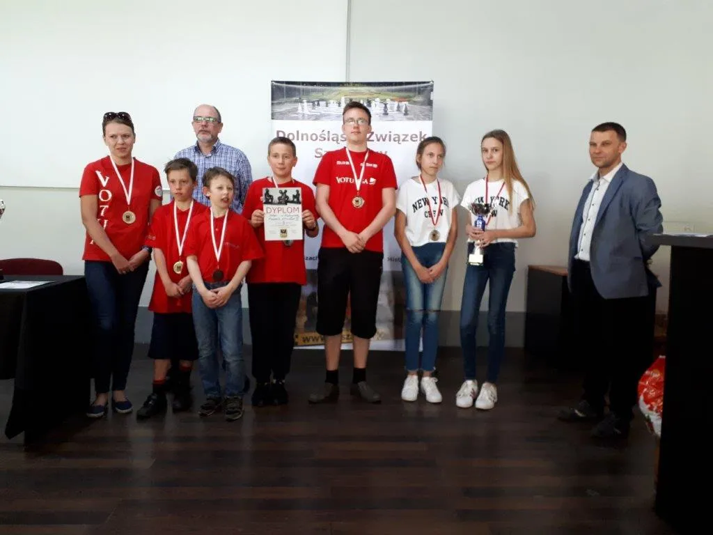 Zdobywcy 2. miejsca (od lewej): Paulina Cagara (trener), Michał Demski, Dominik Kulaś (Prezes DZSzach), Błażej Grot, Piotr Madajczak, Jakub Madajczak, Marta Krzyżosiak, Anna Krzyżosiak, Artur Adamek (sędzia) Nasi mniej doświadczeni zawodnicy - niż z pierwszej i drugiej drużyny, MDK Fabryczna Polonia Wrocław III, wystąpiła w składzie: