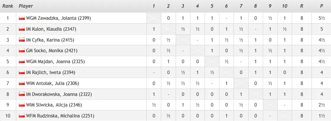 Przedostatnia runda Indywidualnych Mistrzostw Polski Kobiet był bardzo udany dla zawodniczek Polonii Wrocław :) 73. PGNiG TERMIKA Indywidualne Mistrzostwa Polski Kobiet Brawo Jola! Brawo Iweta! Obie nasze reprezentantki w Indywidualnych Mistrzostwach Polski Kobiet wygrywają w przedostatniej rundzie! Jola pokonał Joannę Majdan, czyli bezpośrednią rywalkę do złotego medalu, i na rundę przed zakończeniem jest samodzielną liderką z przewagą 0,5 pkt nad Klaudią Kulon :) Iweta zdobyła swój 4 punkt, wygrywając z Moniką Soćką i po ośmiu rundach dzieli miejsca 6-8. W ostatniej rundzie czekają nas derby Polonii Wrocław! Jola gra z Iwetą :) Partie naszych zawodniczek (aby wybrać partie, należy nacisnąć pasek nad szachownicą i wtedy powinna wyświetlić się lista z pozostałymi partiami) 1. e4 c5 2. Nf3 d6 3. d4 cxd4 4. Qxd4 Nc6 5. Bb5 a6 6. Bxc6+ bxc6 7. O-O e5 8. Qd3 Qc7 9. c4 Be6 10. Nc3 Nf6 11. b3 Be7 12. Ng5 Bd7 13. Ba3 Nh5 14. Nf3 Nf4 15. Qe3 Qa5 16. Bb2 O-O 17. c5 Bg4 18. Na4 Rad8 19. h3 Bh5 20. Kh2 f6 21. Nh4 d5 22. Nf5 Rfe8 23. exd5 Rxd5 24. g3 Nd3 25. Nxe7+ Rxe7 26. Nb6 Rd8 27. Nc4 Qc7 28. Bc3 Qd7 29. Ba5 Rf8 30. Nd6 e4 31. Bc3 Bf3 32. Rad1 Bxd1 33. Rxd1 f5 34. Rxd3 exd3 35. Qxd3 Qe6 36. Qd4 h6 37. Kg2 Kh7 38. Qd3 Qe2 39. Qd4 Qxa2 40. g4 fxg4 41. Qd3+ g6 42. Ne4 Qxb3 43. hxg4 Rxe4 0-1 1. Nf3 Nf6 2. c4 b6 3. b3 Bb7 4. Bb2 e6 5. e3 c5 6. Nc3 Be7 7. d4 cxd4 8. Qxd4 Nc6 9. Qd2 O-O 10. Rd1 d5 11. cxd5 exd5 12. Bb5 Bb4 13. Bxc6 Bxc6 14. O-O Rc8 15. Qd4 Qe7 16. Qh4 Bb7 17. Nb5 Ne4 18. Qxe7 Bxe7 19. Nfd4 Bf6 20. f3 Nc5 21. Rf2 Rce8 22. Bc1 a6 23. Nd6 Rd8 24. Nxb7 Nxb7 25. Nc6 Rd6 26. Rc2 Re8 27. Nd4 g6 28. Kf2 Kg7 29. Ba3 Rd7 30. Rc6 Bxd4 31. Rxd4 Re6 32. Rc8 f5 33. Bb2 Kf7 34. Rh8 h5 35. Rh7+ Ke8 36. Rxd7 Kxd7 37. Rxd5+ Kc6 38. Rd2 a5 39. Ba3 b5 40. Rc2+ Kb6 41. Bb2 Nd8 42. Bd4+ Ka6 43. Kg3 Nc6 44. Kf4 Nb4 45. Rd2 Nd5+ 46. Kg5 b4 47. Rc2 Kb7 48. g3 Nc3 49. Rd2 Nd5 50. h4 Nc3 51. a4 Nd5 52. Rc2 Nc3 53. Bxc3 Rc6 54. Bxb4 Rxc2 55. Bxa5 Rg2 56. Kf4 Rb2 57. Bc3 Rxb3 58. Bd4 Rb1 59. Kg5 Rf1 60. f4 Rg1 61. Kxg6 Rxg3+ 62. Kxf5 Kc6 63. a5 Kb5 64. e4 Kxa5 65. e5 Kb5 66. e6 Kc6 67. Kf6 Ra3 68. f5 Ra5 69. Bc3 Rb5 70. Be5 Ra5 71. Bf4 Ra4 72. Bg5 Ra5 73. Kg6 Kd6 74. e7 Kd7 75. f6 Ra6 76. Kg7 1-0 Tabela po 8 rundach: