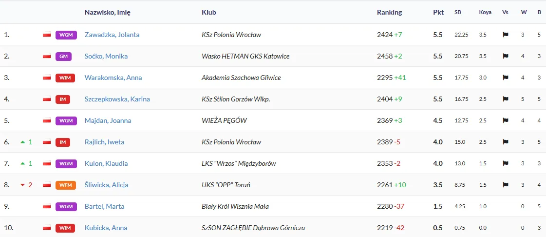 Przedostatnia runda Indywidualnych Mistrzostw Polski przyniosła naszym zawodnikom dwa zwycięstwa! Swoje partie wygrali Iweta Rajlich i Daniel Sadzikowski (pierwsze w mistrzostwach). Status quo wśród Pań utrzymane po remisie Jolanty Zawadzkiej z Anna Warakomską oraz Moniki Soćko z Kariną Szczepkowską, gdzie wszystkie cztery Panie mają po ośmiu rundach po 5,5 pkt. Wśród Panów niestety Mateusz przegrywa drugi raz z rzędu (tym razem polonista przegrał z Grzegorzem Gajewski)