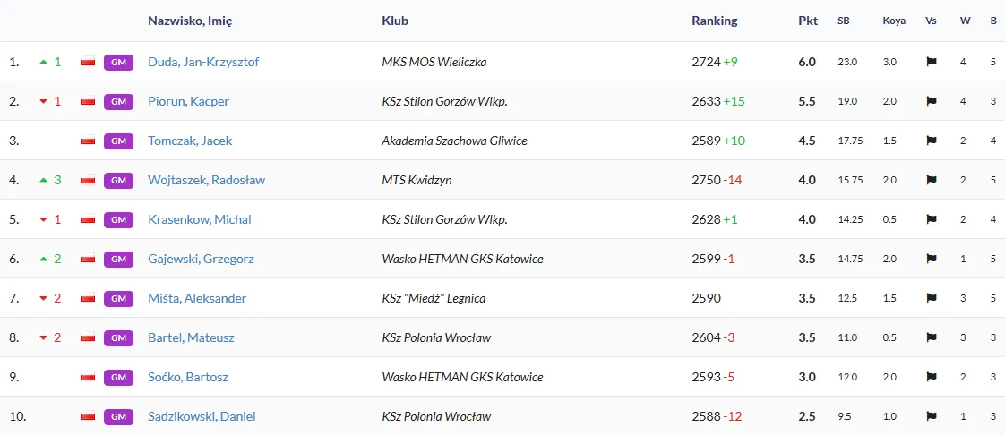 LOTTO Indywidualne Mistrzostwa Polski 8. RUNDA: Daniel Sadzikowski - Aleksander Miśta 1-0 Mateusz Bartel - Grzegorz Gajewski 0-1 Michał Krasenkow - Radosław Wojtaszek 0-1 Kacper Piorun - Jan-Krzysztof Duda 0-1 Bartosz Soćko - Jacek Tomczak 1-0 WYNIKI - TUTAJ Kojarzenie 9. rundy: Tomczak - Krasenkow, Gajewski - Soćko, Duda - Bartel, Miśta - Piorun, Wojtaszek - Sadzikowski Wyniki po 8. rundach