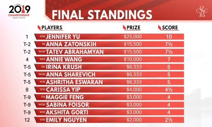 Zawodniczka miała wspaniały turniej, remisując zaledwie 2 partie. Kluczową partią była runda 10., w której Yu mierzyła się z Anną Zatonskih, która jest jedną z najwyżej notowanych szachistek Ameryki (2430) i w momencie pojedynku zajmowała drugie miejsce. Był to więc bezpośredni pojedynek liderek! Yu grała naprawdę świetnie i mimo czarnego koloru pokonała Zatonskih.
