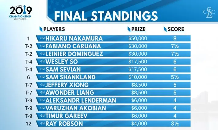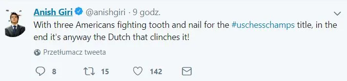W turnieju mężczyzn nie było tak jasnej sytuacji. Przed ostatnią, 11. rundą pierwsze miejsce dzieliło trzech zawodników - Nakamura, Caruana i Dominguez! Tuż za nimi, z tylko połową punktu straty był So. To oznaczało, że w ostatniej rundzie cała czwórka zawodników chciała grać na wygraną. Dominguez mimo lepszej pozycji z niżej notowanym Gareevem nie zdołał zdobyć pełnego punktu i partia zakończyła się remisem. Caruana nie zdołał stworzyć większych problemów Shanklandowi. Z kolei So przegrał swoją partię! Nakamura za to w pełni wykorzystał swoje szanse i po wybraniu agresywnej Obrony Holenderskiej wygrał swoją partię, a także całe Mistrzostwa! Holenderski arcymistrz Anish Giri, który znany jest ze swojego ciętego humoru, oczywiście nie mógł się powstrzymać od komentarza ;)