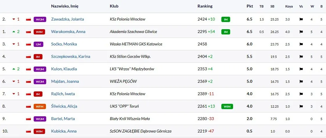 9. RUNDA: Alicja Śliwicka - Joanna Majdan 1/2 Iweta Rajlich - Klaudia Kulon 0-1 Jolanta Zawadzka - Anna Kubicka 1-0 Karina Szczepkowska - Anna Warakomska 0-1 Marta Bartel - Monika Soćko 1/2 WYNIKI – TUTAJ Wyniki po 9. rundach