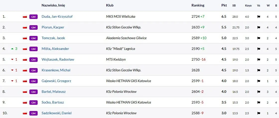 LOTTO Indywidualne Mistrzostwa Polski 9. RUNDA: Jacek Tomczak - Michał Krasenkow 1/2 Grzegorz Gajewski - Bartosz Soćko 1/2 Jan Krzysztof Duda - Mateusz Bartel 1/2 Aleksander Miśta - Kacper Piorun 1-0 Radosław Wojtaszek - Daniel Sadzikowski 1/2 WYNIKI - TUTAJ Wyniki po 9. rundach