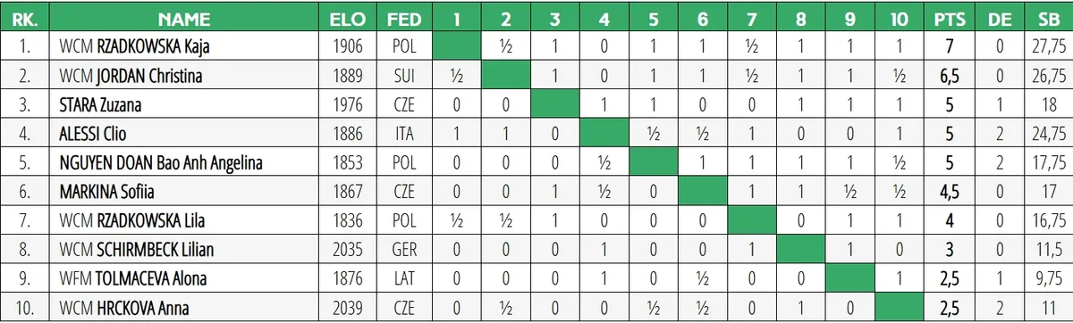 Kaja Rządkowska wygrywa turniej kołowy FUTURES, który odbył się w ramach Prague Chess Festival (24.02-6.03.2026)! Ogromne gratulacje Kaja! Do turnieju zostało zaproszonych 10 zawodniczek młodego pokolenia z Europy. Oprócz wspomnianej Kai w zawodach zagrała także jej siostra - Lila, która zajęła 7. miejsce! O prestiżu zawodów świadczy fakt, że był to jeden z głównych turniejów Festiwalu - obok grupy MASTERS, gdzie zagrał m.in. aktualny Mistrz Świata Dommaraju Gukesh oraz grupy CHALLENGERS w której zawodnicy rywalizowali o przepustkę do przyszłorocznych zawodów w grupie MASTERS. Gratulacje Kaja! Gratulacje Lila! Pełne wyniki - TUTAJ Tabela zawodów: