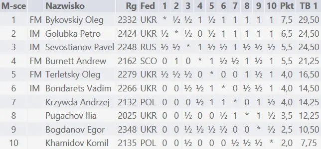 We Lwowie dobiegł końca turniej kołowy na normę mistrza międzynarodowego. W grupie A rywalizował m.in. Komil Khamidov z Polonii Wrocław. Komil zdobył 2 punkty, zaliczając cztery remisy – z Pavlem Sevostianovem z Rosji, Ukraińcami: Egorem Bogdanovem i Ilią Pugachovem oraz z Polakiem Andrzejem Krzywdą. Zwyciężył Oleg Bykovskiy z Ukrainy, który zgromadził 7,5 pkt. Klasyfikacja końcowa – TUTAJ.