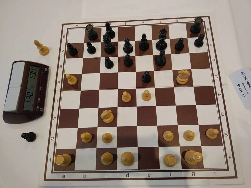 T__urniej w Zurychu rozpocząłem od sporej wpadki. W pierwszej rundzie zremisowałem z Carmim Haasem, zawodnikiem o rankingu 2211, który był ode mnie starszy o...43 lata. Do tego, już po 15 ruchach miałem piona więcej i wygraną pozycję. Niestety, potem grałem bardzo źle i w pewnym momencie mój przeciwnik wyraźnie się rozkręcił, przechwytując inicjatywę w grze środkowej. Dzisiaj, w porannej rundzie, grałem dopiero na 23 szachownicy, a mój rywal o wdzięcznym nazwisku Paleologu miał ranking 2114. Partia zakończyła się w... 10 posunięć, a pozycja końcowa widnieje na zdjęciu. O 16:00 gram trzecią rundę, w której moim rywalem będzie mój rówieśnik i rywal z turniejów juniorskich, Oliver Kurmann.