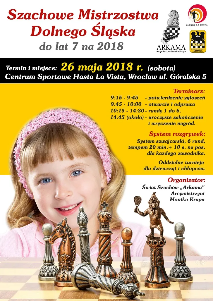 W najbliższą sobotę (26.05) we Wrocławiu odbędą się Mistrzostwa Dolnego Śląska do lat 7! Bardzo serdecznie zachęcamy wszystkie dzieci do lat 7 do uczestnictwa w Mistrzostwach! Mistrzostwa Dolnego Śląska do lat 7, odbędą się w najbliższą sobotę (26.05.2018) w Centrum Sportowym “Hasta la Vista” we Wrocławiu, ul. Góralska 5. Prosimy o wcześniejsze zgłoszenia, które przyjmuje Arcymistrzyni Monika Krupa – e-mail m.krupa@vp.pl w terminie do 25 maja 2018 r. Wpisowe do zawodów wynosi 20 zł, które bez wcześniejszego zgłoszenia wzrasta o 5 zł. Potwierdzenie zgłoszeń oraz przyjmowanie nowych będą przyjmowane od godziny 9:15 do 9:45. Mistrzostwa zostaną rozegrane na dystansie 6 rund, granych tempem 20 minut + 10 sekund na posunięcie na zawodnika. Komunikat zawodów – TUTAJ Serwis turniejowy chłopców – TUTAJ Serwis turniejowy dziewczynek – TUTAJ