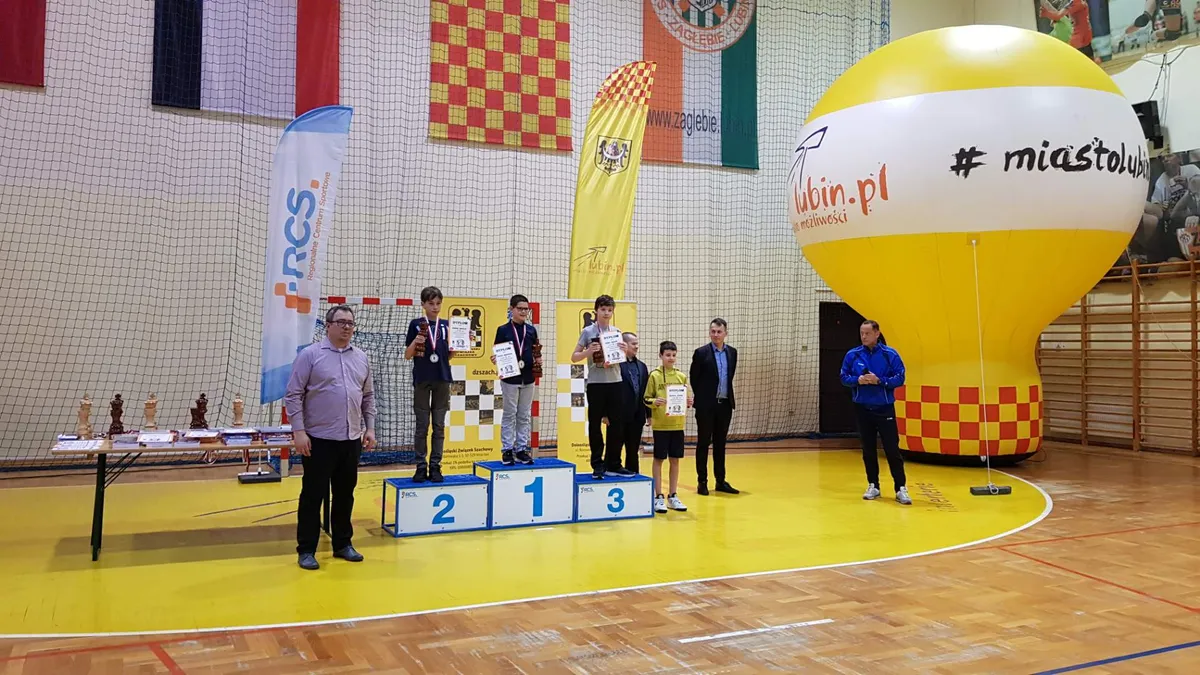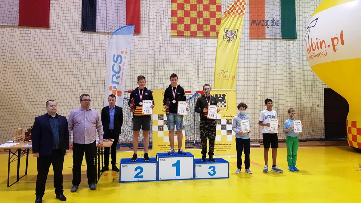 Filip Nowak na drugim stopniu podium, fot. Dorota Janikowska Połączona grupa dziewcząt i chłopców do lat 18 W mistrzostwach zagrało 22 zawodników, którzy rozegrali 7 rund, granych tempem 30'+30".