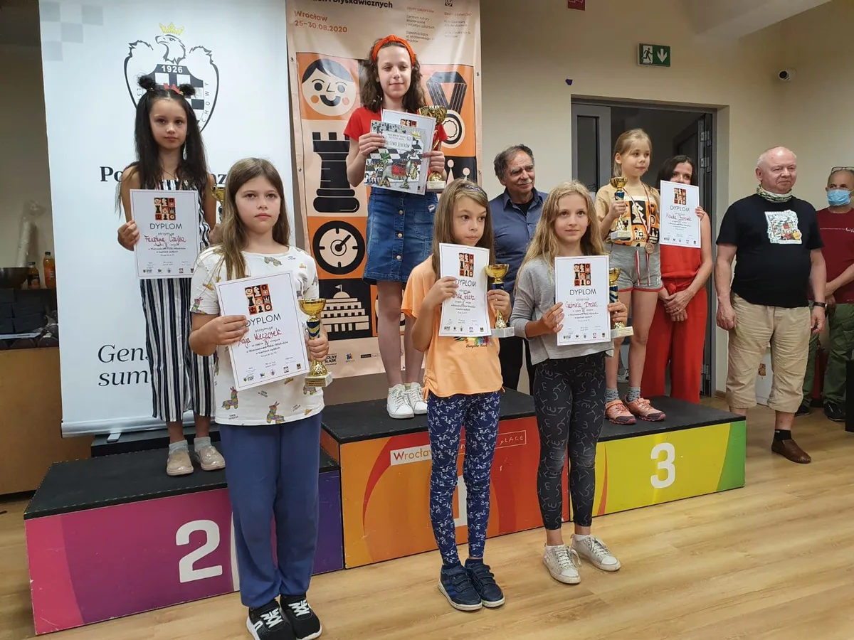 Po grupie wiekowej 14-18 lat, która rozegrała Mistrzostwa Polski Juniorów w Szachach Szybkich i Błyskawicznych w dniach 25-27.08.2020, przyszła pora na najmłodszych :) W tegorocznych mistrzostwach w grupie wiekowej 8-12 lat zagrało 25 zawodników Polonii Wrocław! I tak, dwudniowe zmagania w szachach szybkich (11 rund, tempo 15'+10") przyniosły naszym zawodnikom jeden medal, ale za to złoty :) Mistrzynią Polski Juniorów w Szachach Szybkich została Wiktoria Śmietańska! Gratulacje! Dla Wiktorii to czwarty z rzędu złoty medal w Mistrzostwach Polski Juniorów w Szachach Szybkich (poprzednio 2017-2018 do lat 8 i 2019 do lat 10). Miejsca w pierwszej “10” zajęli: Maja Wieczorek (dziewczęta do lat 10) – 4. miejsce, Rządkowska Kaja (dziewczęta do lat 8) - 5. miejsce, Rządkowska Lila (dziewczęta do lat 7) - 7. miejsce, Grobelny Mikołaj (chłopcy do lat 10) - 7. miejsce, Ochędzan Filip (chłopcy do lat 10) - 8. miejsce. Jutro zostaną rozegrane mistrzostwa w szachach błyskawicznych (w przedziale wiekowym 8-12 lat) Poniżej pełne wyniki polonistów: Dziewczęta do lat 8