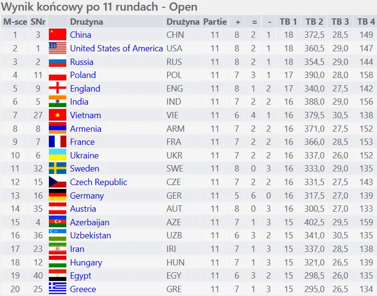 A było tak blisko medalu! Polacy w ostatniej rundzie remisują z Indiami i przy niesprzyjających wynikach kończą Olimpiadę na 4. miejscu :( Polki, po remisie z Hiszpankami zakończyły Olimpiadę na 16. miejscu. DZIĘKUJEMY ZA WIELKIE EMOCJE, KTÓRE NAM ZAFUNDOWALIŚCIE PRZEZ CAŁĄ OLIMPIADĘ! Polacy w ostatnim meczy olimpiady zremisowali z Indiami, co przy remisie Chin z USA i zwycięstwie Rosjan z Francuzami dało nam ostatecznie 4. miejsce :( Co i tak jest najlepszym wynikiem naszych Panów w powojennych szachach. Poprzedni najlepszy rezultat Polacy osiągnęli na Olimpiadzie w Baku w 2016 roku (7. miejsce). Najlepiej mecz, jak i całą olimpiadę, opisze nasz kapitan, uczestnik wielu olimpiad, zdobywca brązowego medalu ubiegłorocznych Drużynowych Mistrzostw Świata - Mateusz Bartel: