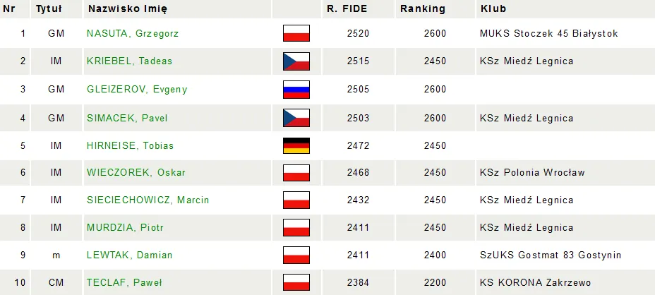 W Legnicy rozpoczyna się dzisiaj tradycyjny turniej kołowy z możliwością wypełnienia normy na arcymistrza. W 34. Pucharze Wojewody Dolnośląskiego zagra Oskar Wieczorek! Tradycyjnie już, w listopadzie, w Legnicy odbywa się turniej kołowy (każdy gra z każdym) złożony z 10. zawodników, którzy będą grali o zwycięstwo w 34. Pucharze Wojewody Dolnośląskiego! W tym roku, w prestiżowym turnieju, będziemy mieli swojego zawodnika w osobie Oskara Wieczorka! Zawodnik Polonii Wrocław w gronie 10 zawodników legitymuje się 6 rankingiem. Trzymamy kciuki za Oskara, który będzie walczyło o swoją drugą normę na arcymistrza szachowego! Pierwszą normę Oskar wypełnił podczas Ekstraligi (sezon 2016). Polonista w Pucharze Wojewody Dolnośląskiego zagra po raz drugi. Poprzedni występ Oskar zanotował w 2013 roku, kiedy z 4,5 pkt zajął 6. miejsce. Zawody w Legnicy zostaną rozegrane w dniach 22-28.11.2018. Serwis turniejowy - TUTAJ Lista startowa zawodników:
