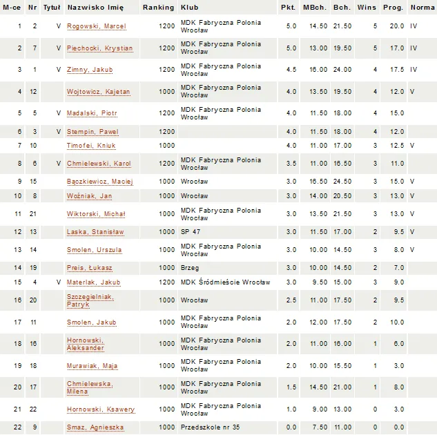 W sobotę (11.03.2017) w naszym klubie odbył się turniej "Pierwszy krok do Mistrzostwa", który dla niektórych młodych zawodników był pierwszym turniejem w życiu! W minioną sobotę, w klubie na ul. Wita Stwosza we Wrocławiu, byliśmy wraz z MDK Fabryczna Wrocław organizatorami turnieju dla najmłodszych adeptów królewskiej gry. Na liście startowej turnieju znalazło się 22 zawodników, którzy rozegrali 6 rund, granych tempem 30 minut na zawodnika. Turniej ze wszech miar okazał się udany, ponieważ aż dziesięcioro dzieci zdobyło kategorię szachową! Czwartą kategorię zdobyli: Rogowski Marcel, Piechocki Krystian oraz Zimny Jakub! Piątą kategorię szachową uzyskali: Wojtowicz Kajetan, Timofei Kniuk, Bączkiewicz Maciej, Woźniak Jan, Wiktorski Michał, Laska Stanisław oraz Smoleń Urszula. Gratulacje dla wszystkich uczestników turnieju!