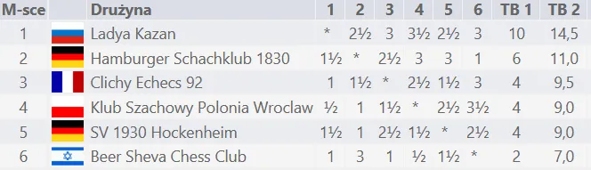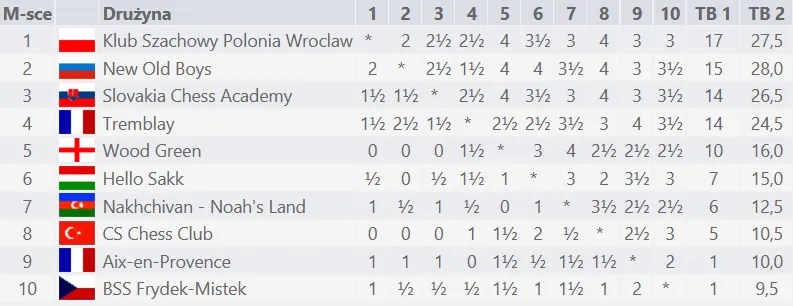 Klub Szachowy Polonia Wrocław zagrała w Klubowym Pucharze Europy online! W dniach 27-29.03.2021 nasz klub zagrał w Klubowym Pucharze Europy online! Do zawodów zgłosiło się w sumie 91 zespołów (nasza drużyna miała 22 średni ranking zawodników), które zostały podzielone na dziewięć grup. Zawody rozgrywano na 4 szachownicach (bez obowiązkowej szachownicy kobiecej), granych tempem 15'+5". Pierwsza faza eliminacji, 27-28.03.2021 Pierwszy etap pucharu został rozegrany w dniach 27-28.03.2021. Byliśmy przydzieleni do grupy "G", w której legitymowaliśmy się trzecim rankingiem średnim zawodników. Do kolejnego etapu awansowały 2 najlepsze ekipy z grup. Awans wywalczyliśmy bardzo pewnie odnosząc 8 zwycięstw i 1 remis. Poniżej tabela z wynikami: